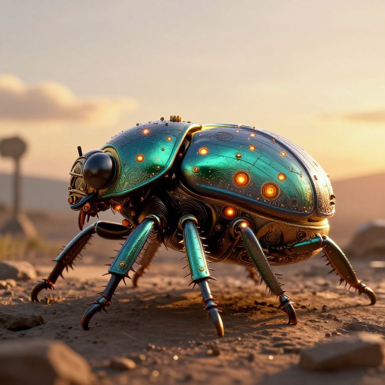 In the style of surrealistic dreamscapes, envision a vast, desolate desert landscape bathed in an otherworldly twilight, with swirling hues of purple and gold illuminating the sky. A colossal mechanical marvel dominates the barren foreground, its intricate gears and cogs visible even from a 'bug's-eye view'. This unique perspective reveals the enchanting interplay between nature and machinery as the insect perceives the erratic motion of the structure's time-defying components. The fantastical fusion of reality and imagination evokes a profound sense of awe and wonder in this barren yet captivating environment.