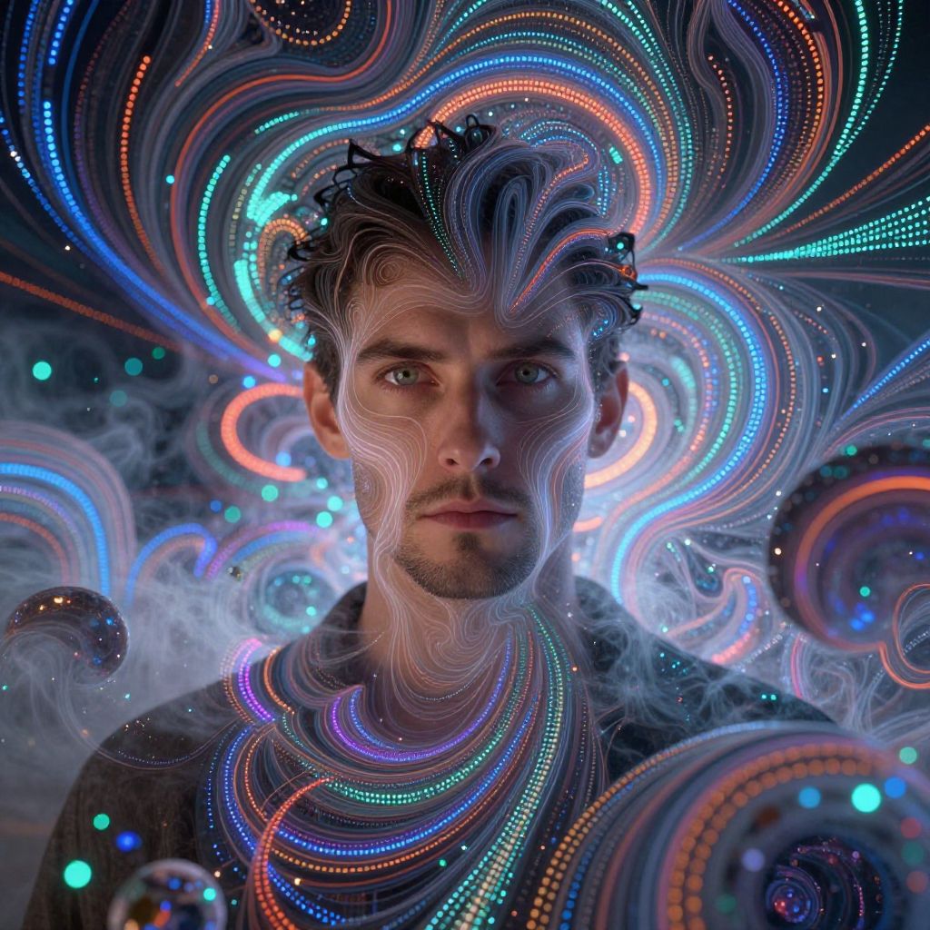 Photograph of a young, Caucasian man with short, curly black hair and blue eyes, centered in the frame. He has a serious expression and is partially obscured by swirling, neon-colored light patterns in blue, orange, and purple that resemble hypnotic trails. These light patterns have a three-dimensional, wavy texture and are dotted with small, glowing blue and orange dots. The background is dark, enhancing the vibrant lights. The man's face is illuminated by the light patterns, which create a surreal, ethereal effect. He is wearing a dark, textured shirt. The overall style is futuristic and psychedelic.