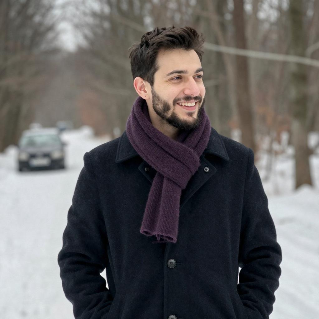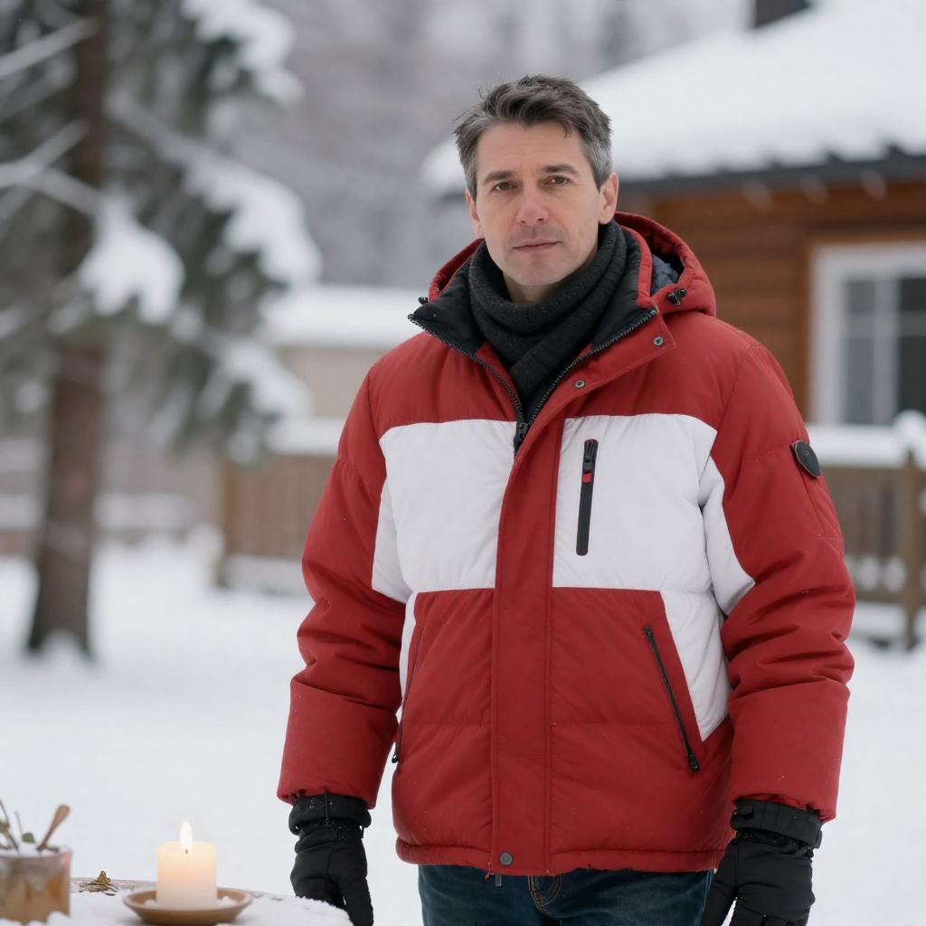 Photograph of a man with light skin and brown hair, wearing a black fur hat with a white star emblem, a black winter jacket with a white star patch, gray mittens, and a beige scarf. He stands against a bright white background, looking slightly to the right with a neutral expression.