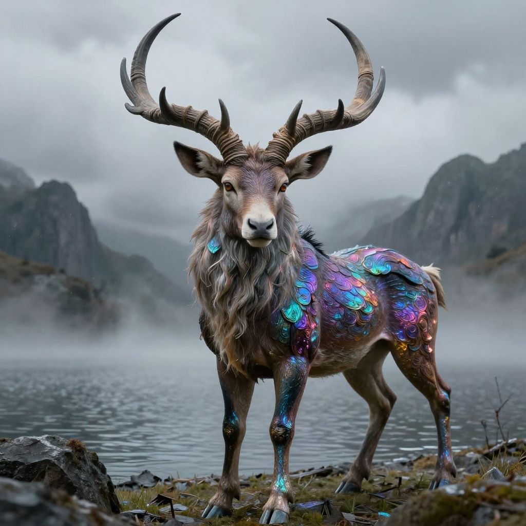 Photograph of a fantastical deer-like creature standing on a rocky lakeshore. The creature has large, intricate, branching antlers and a shaggy, grayish-brown mane. Its body is adorned with vibrant, iridescent scales in shades of blue, purple, and gold. The background features a misty lake with dark, rocky mountains under a cloudy sky. The creature's expression is calm and stoic, with its gaze directed at the camera. The textures of the scales and fur contrast with the rough, wet rocks and the smooth water surface. The overall style is surreal and fantasy-inspired.