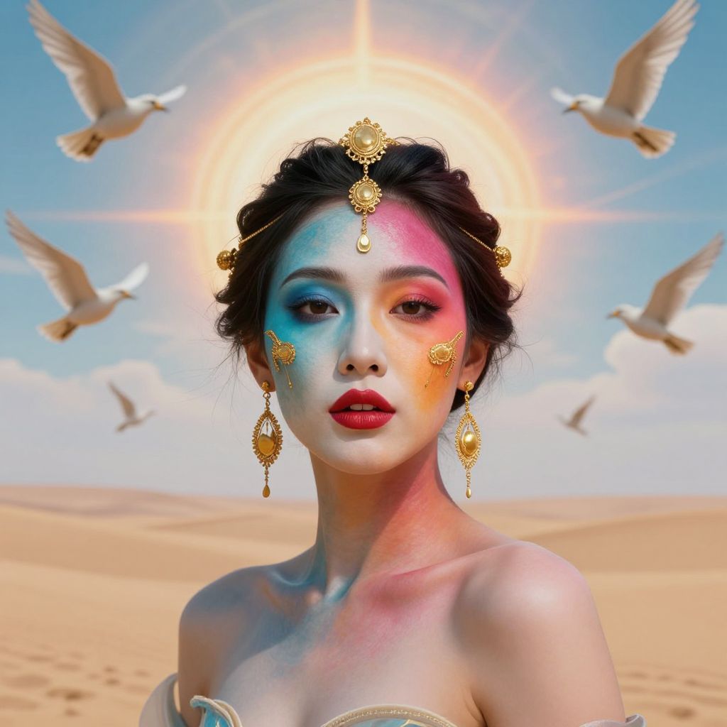 Digital artwork of a woman with multi-colored face paint, red lips, gold headpiece, and earrings, surrounded by white birds in a desert under a