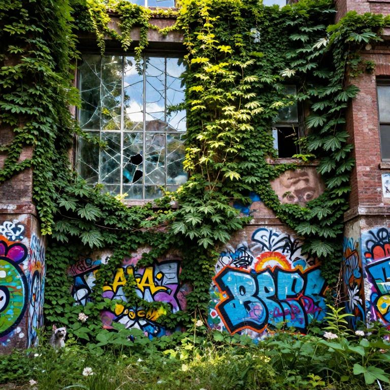 Photograph of an abandoned, ivy-covered brick building with vibrant graffiti and shattered window, sunlight filtering through green leaves.