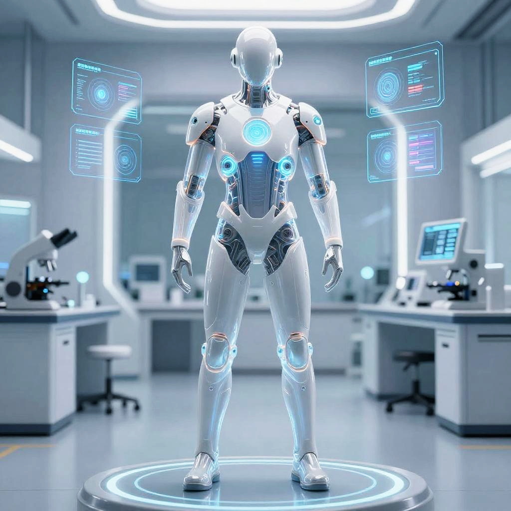 Futuristic suit with transparent elements and pulsating energy cores, worn by a scientist in a high-tech lab, holographic interfaces floating around, sleek and minimalistic design