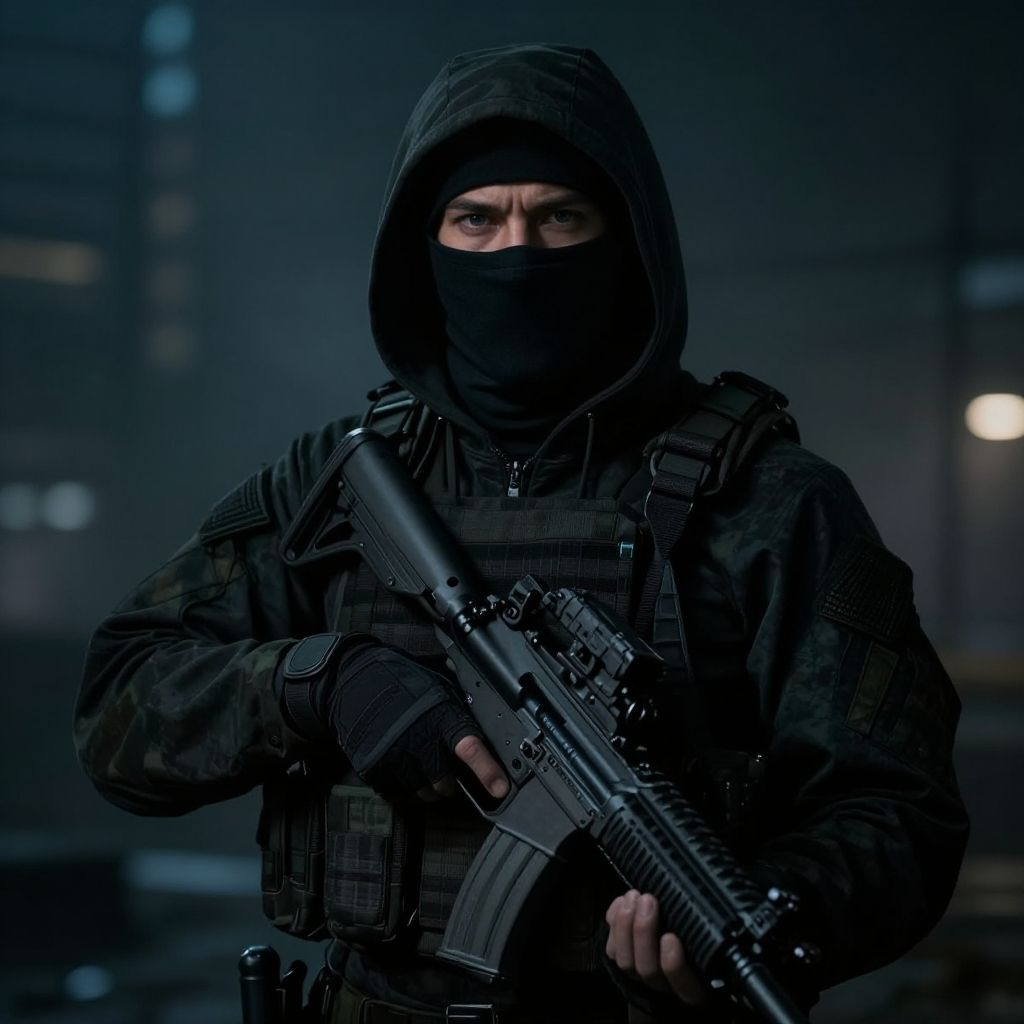 Best texture, high quality, ultra HD, 8K, ultra-detailed face, perfect eyes, realistic, very detailed, high detail, full body of a military assassin with his face visible and wearing hoodie with perfect fingers standing in a distant, dark foggy night city, depth of field, cinematic scene, dramatic lighting