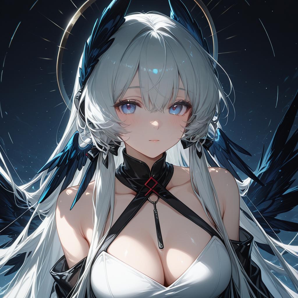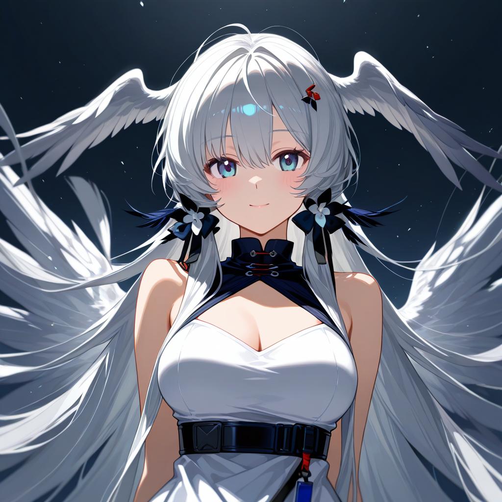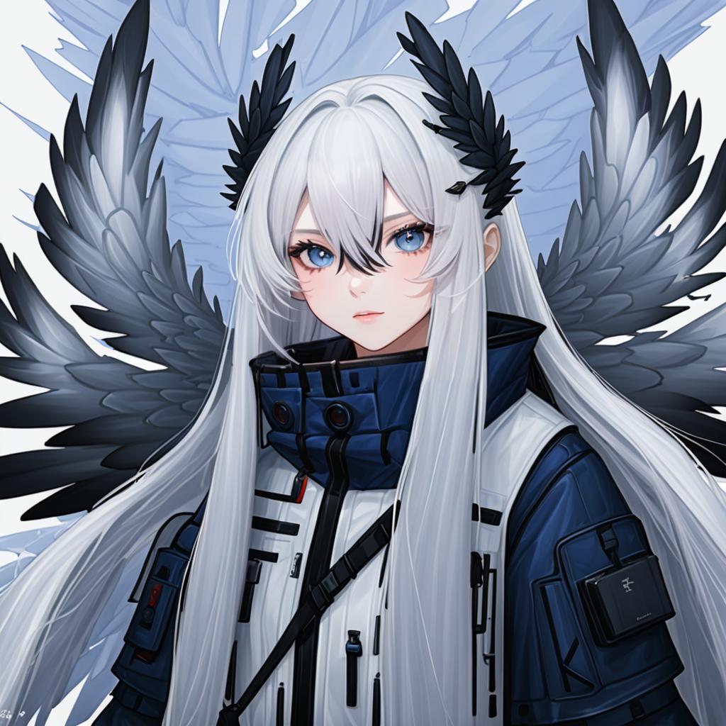 Mulberry (arknights), arknights, 1girl, blue eyes, hair between eyes, very long hair, grey hair, white hair, medium breasts, head wings, feathered wings, by artist kouno (masao), animagine
