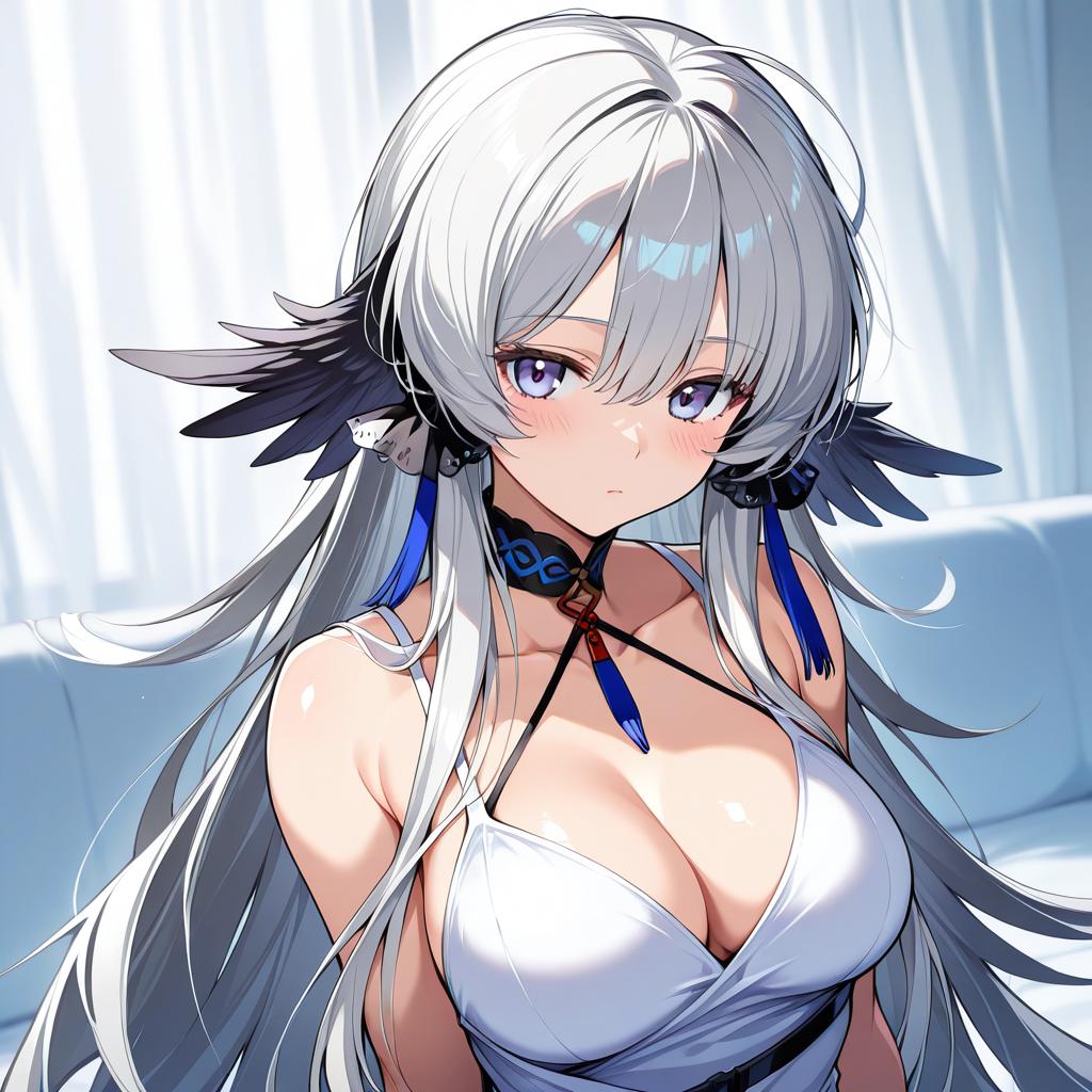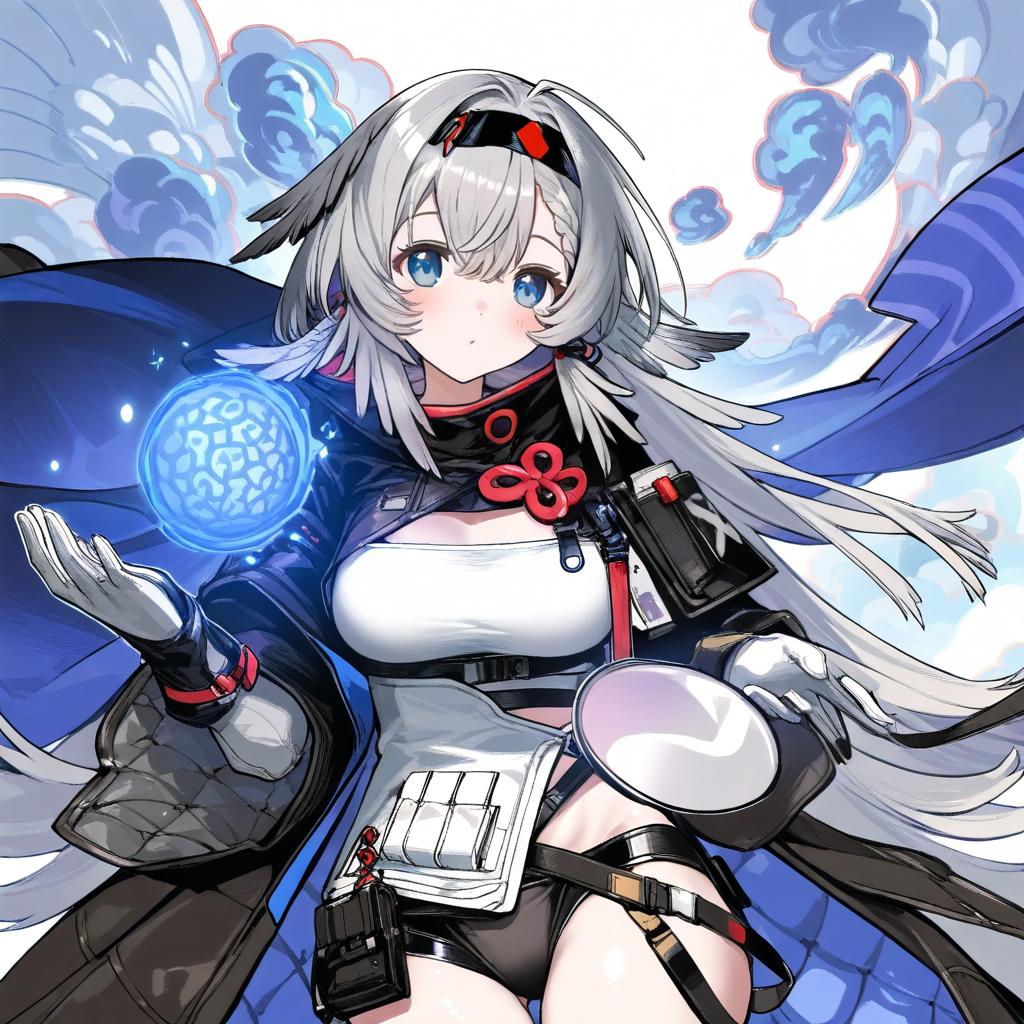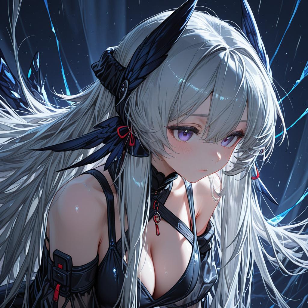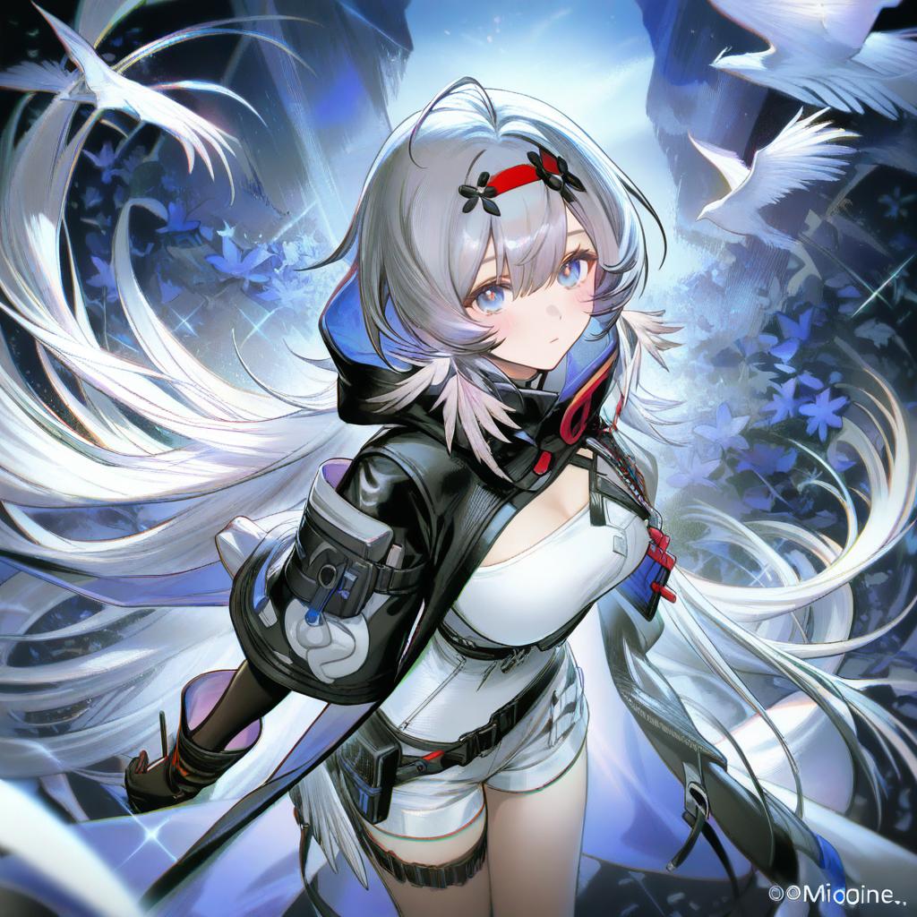 Mulberry (arknights), arknights, 1girl, blue eyes, hair between eyes, very long hair, grey hair, white hair, medium breasts, head wings, feathered wings, by artist kouno (masao), animagine