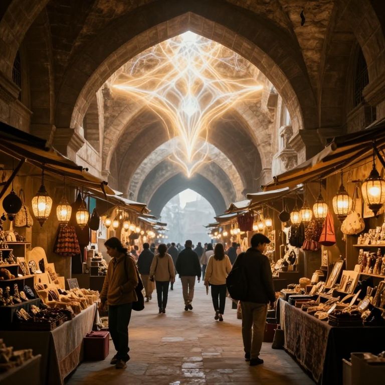Photograph of a bustling, dimly lit indoor market with an arched stone ceiling. Warm, glowing lanterns hang from the ceiling, illuminating rows of stalls on both sides. Shoppers, dressed in casual clothing, walk along a central pathway. Stalls display various items including jewelry, bags, and trinkets. The market's stone walls and arched ceiling create a historical ambiance, with the bright light from the ceiling highlighting the path forward. The background shows a foggy, bright exit, contrasting with the market's warm, inviting glow.