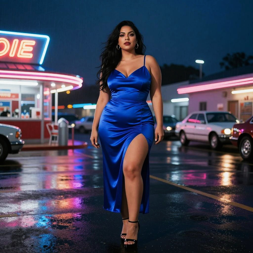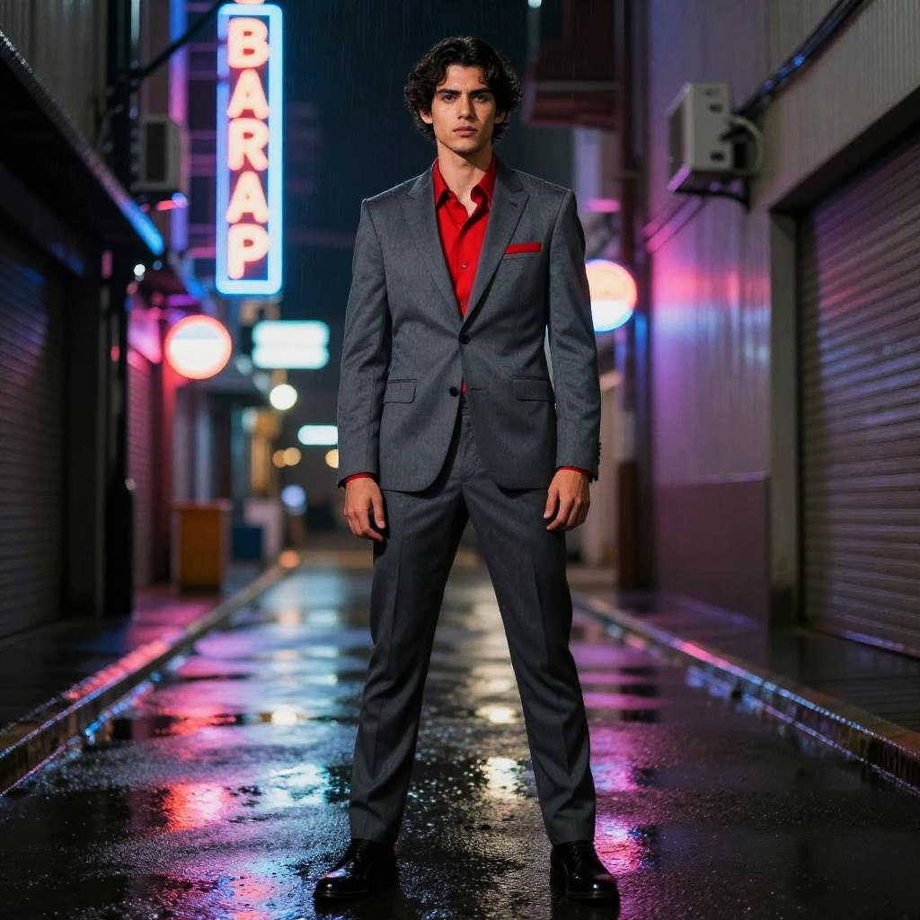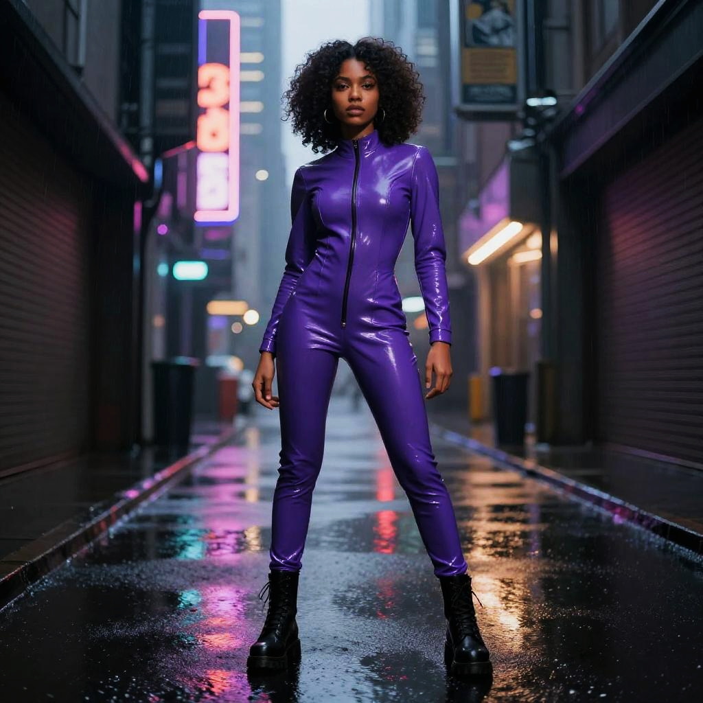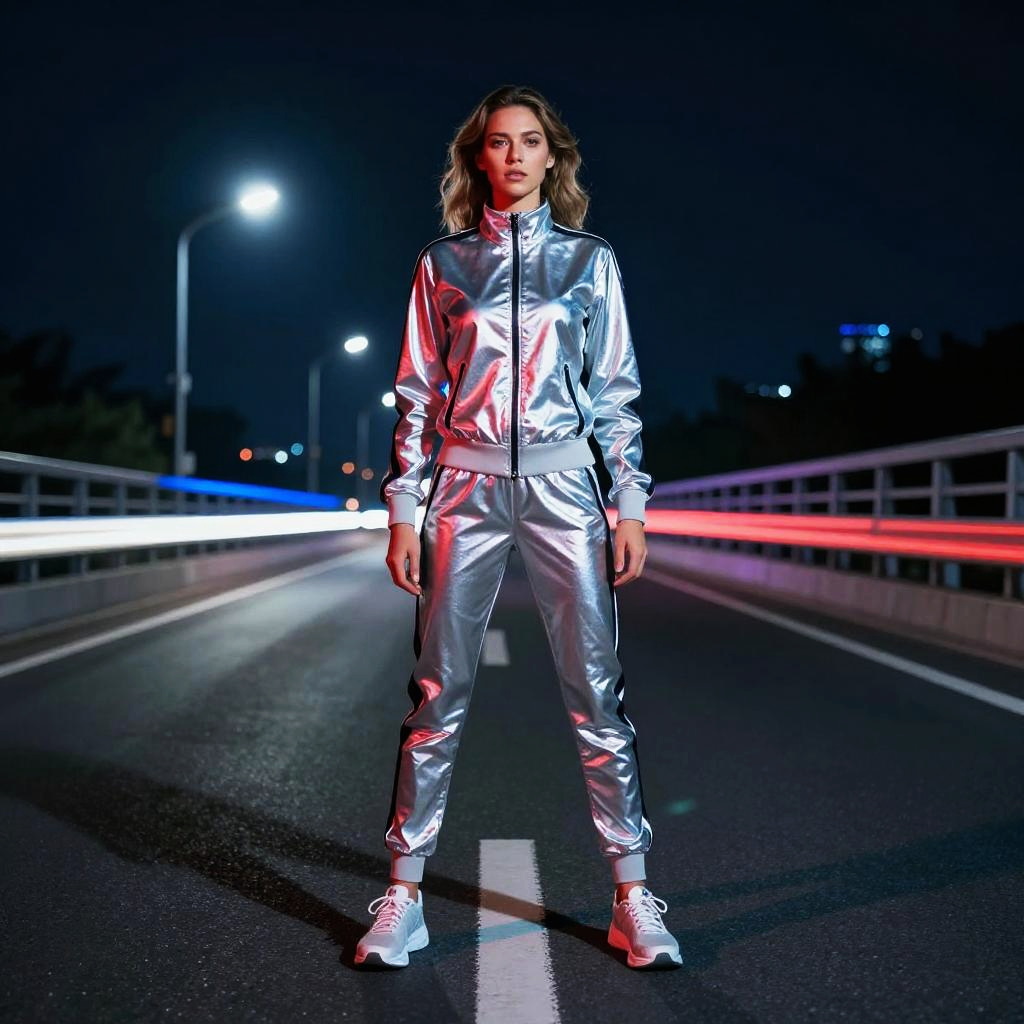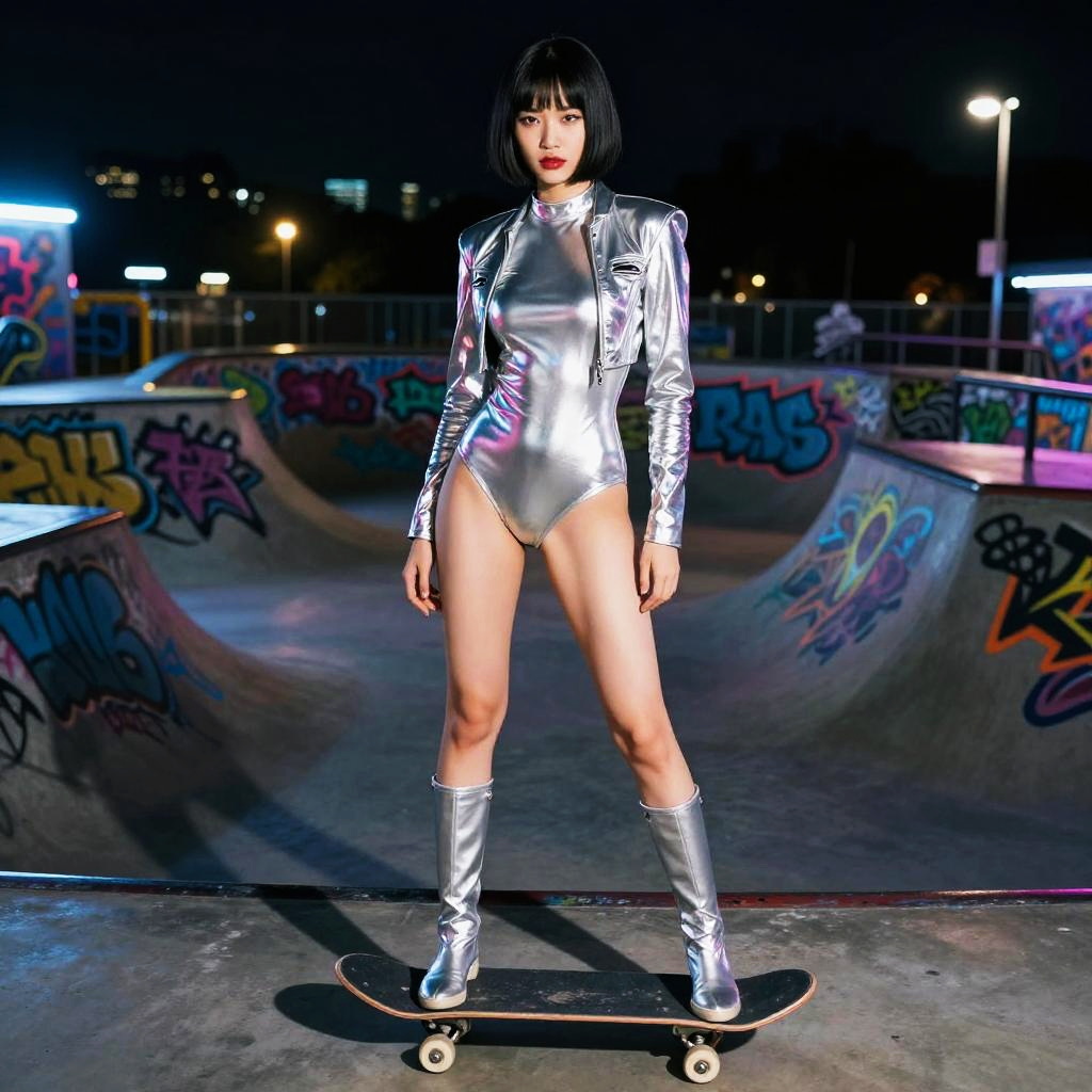 Cinematic full-body shot of a short East Asian female model with sleek black bob wearing a silver metallic bodysuit with asymmetrical jacket, positioned in a neon graffiti-covered skate park at night, captured with dramatic neon lighting and reflective surfaces, shot on a wide-angle lens, high-contrast grain, cinematic shadows.