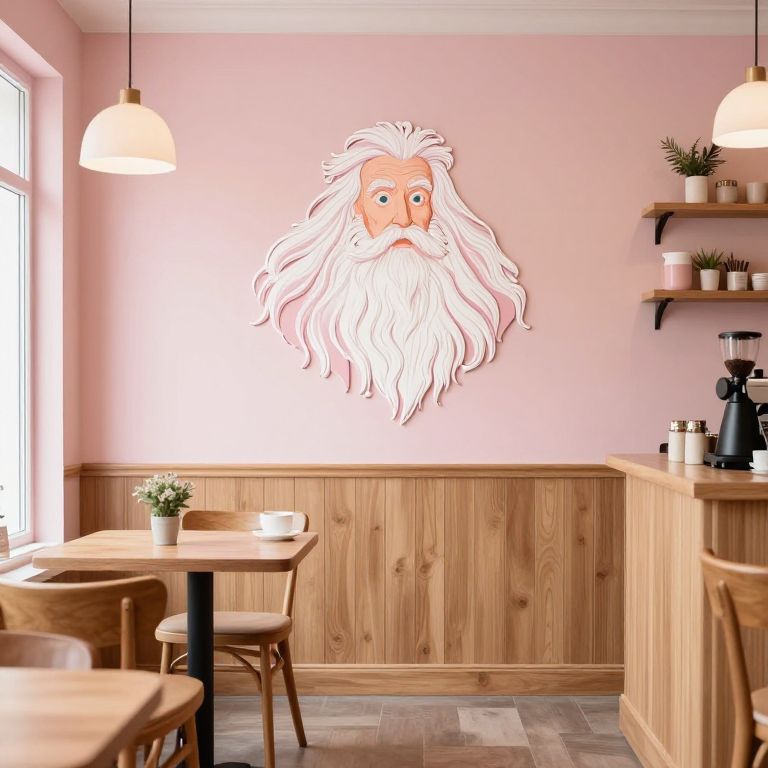 Cozy café with wooden wainscot, pink walls, whimsical white-bearded cartoon face wall decal, wooden chairs, table, pendant lights
