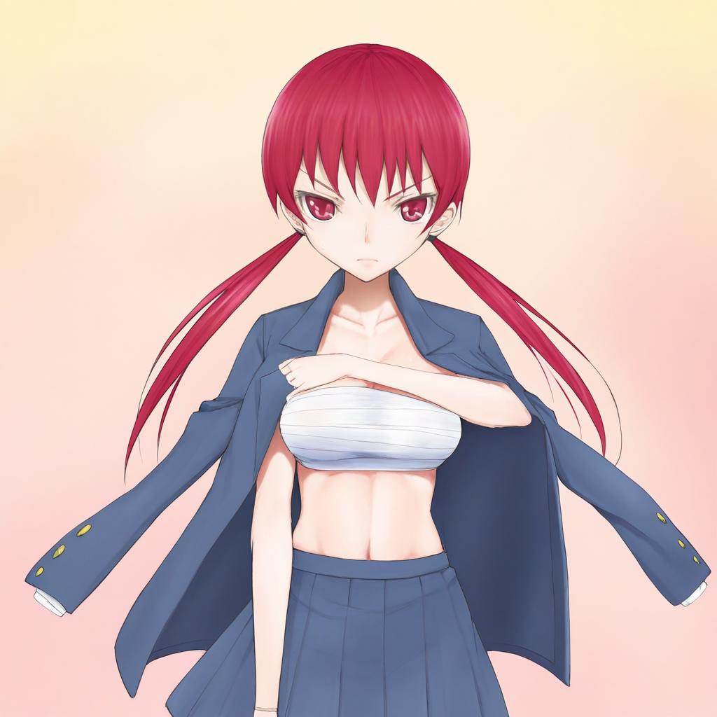 This digital anime-style drawing features a young woman with long, red hair tied in low pigtails. She has fair skin and striking red eyes. She is depicted wearing a blue school uniform with a pleated skirt and an open jacket, revealing a white bandeau top that covers her small to medium-sized breasts. Her expression is neutral yet slightly intense, with a direct gaze at the viewer. The background is a gradient of soft yellow to pink, adding a warm, subtle contrast to her dark blue uniform and vibrant hair. The artwork is clean and crisp, with smooth lines and bright colors.
