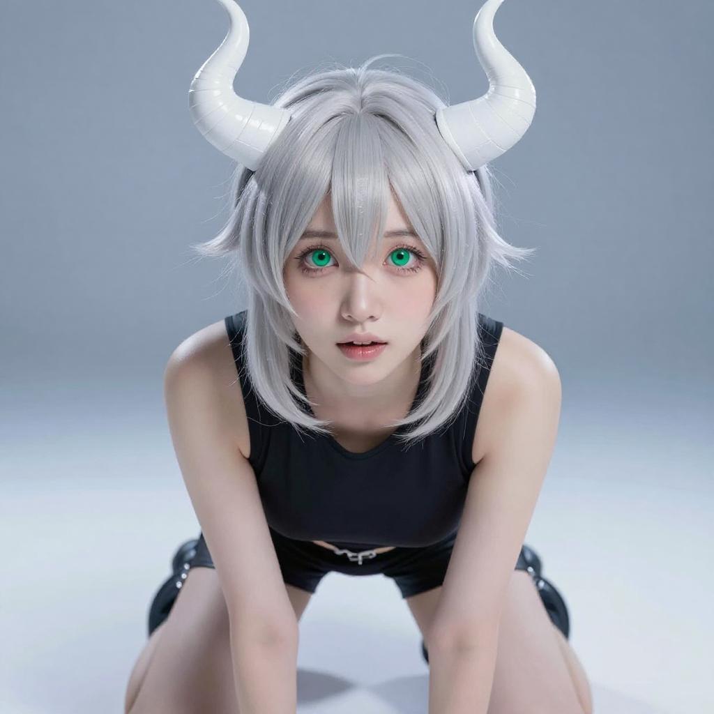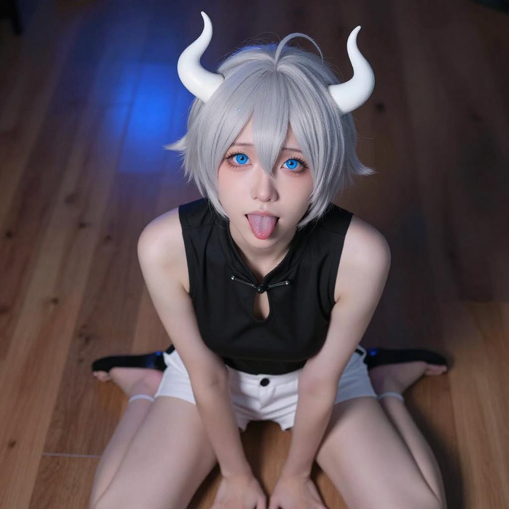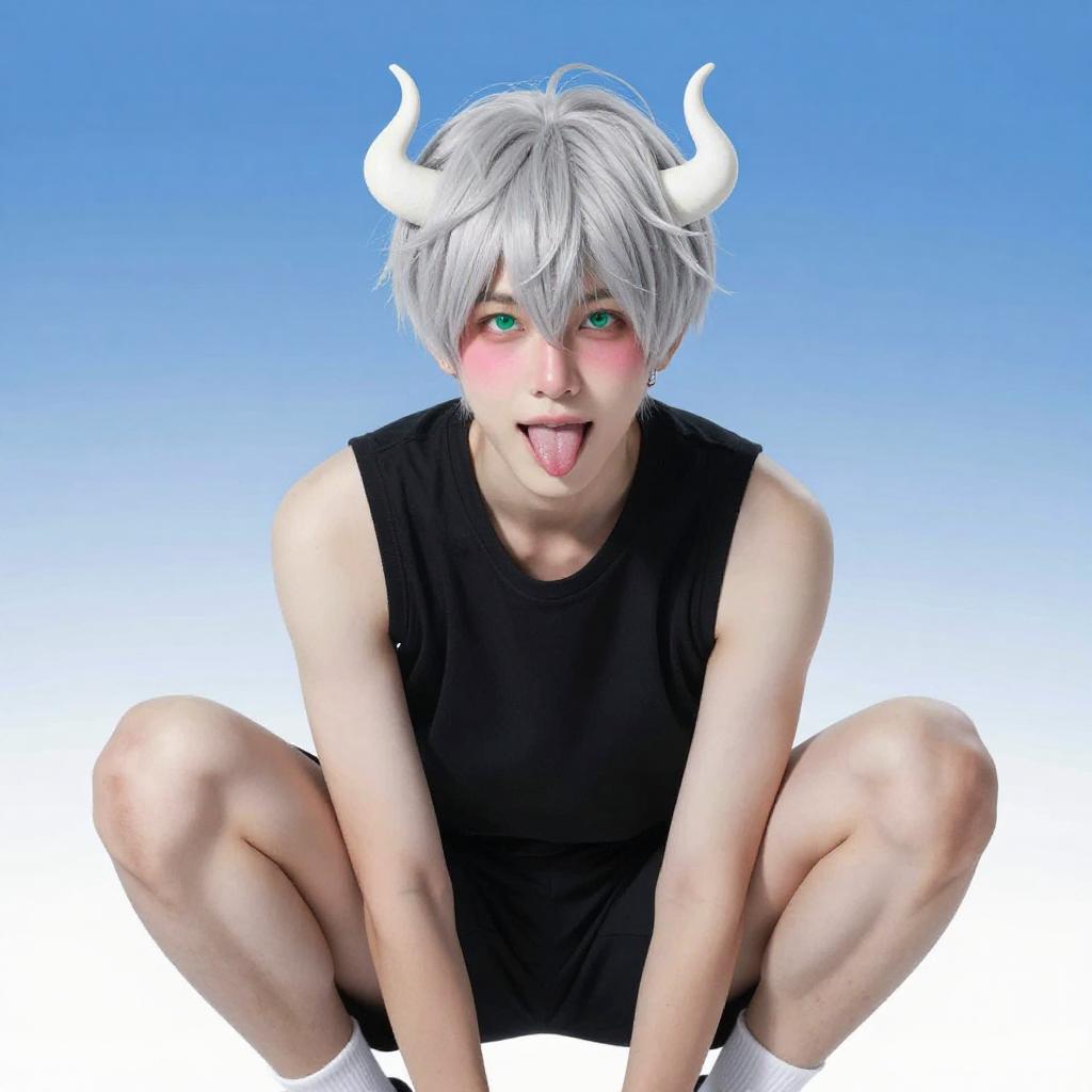 Photograph of a young person with pale skin, silver-white hair, and small white horn-like accessories, squatting with legs apart. They have green eyes, pink blush on cheeks, and their tongue slightly out. Wearing a black sleeveless top, they look directly at the camera with a playful expression. The background is a gradient of blue and white.