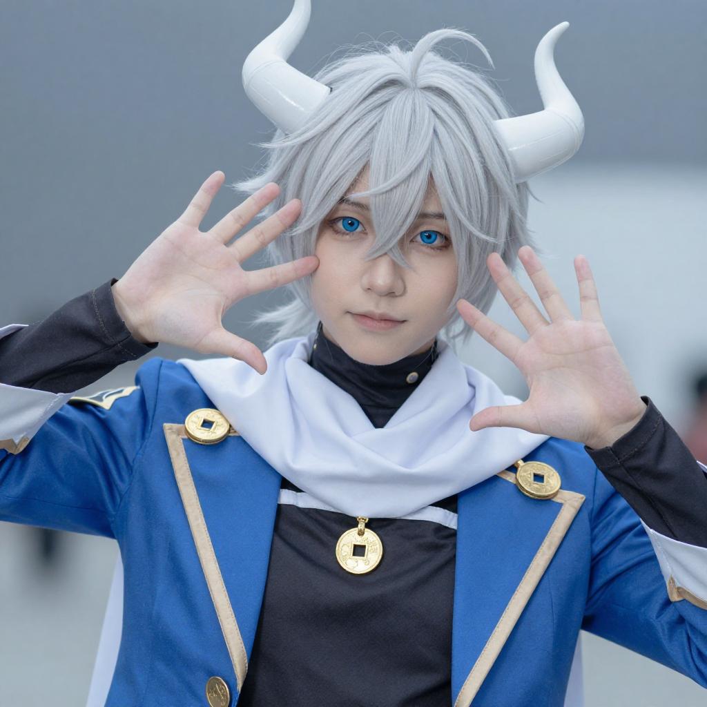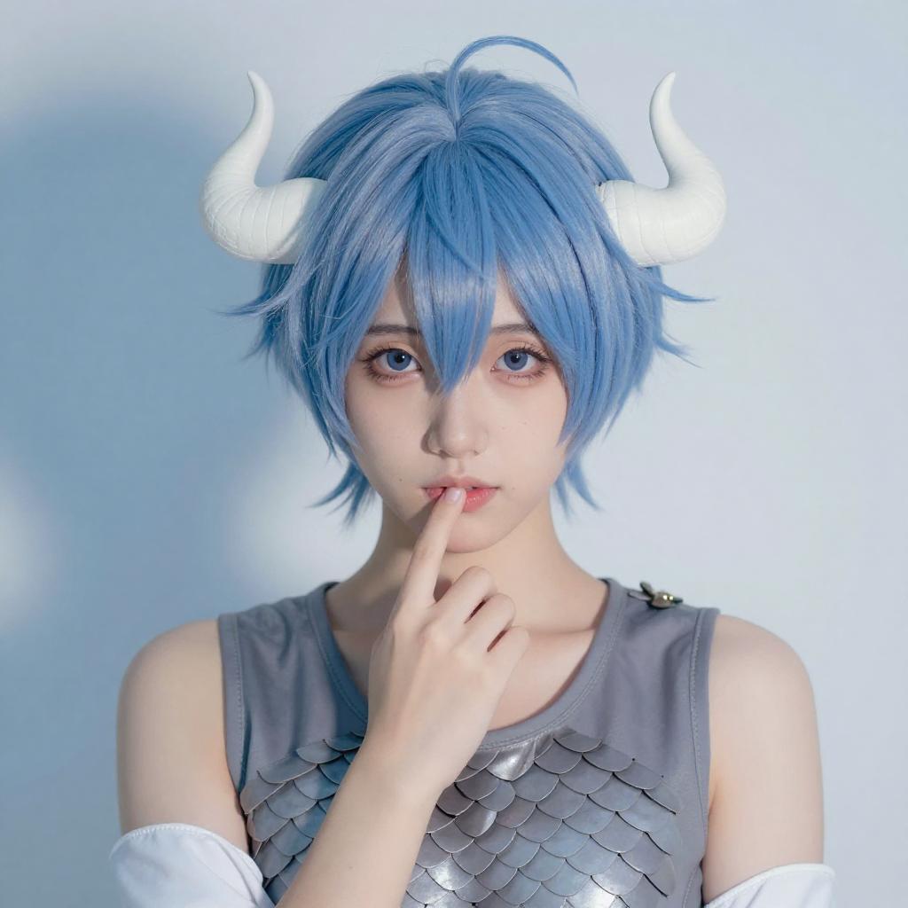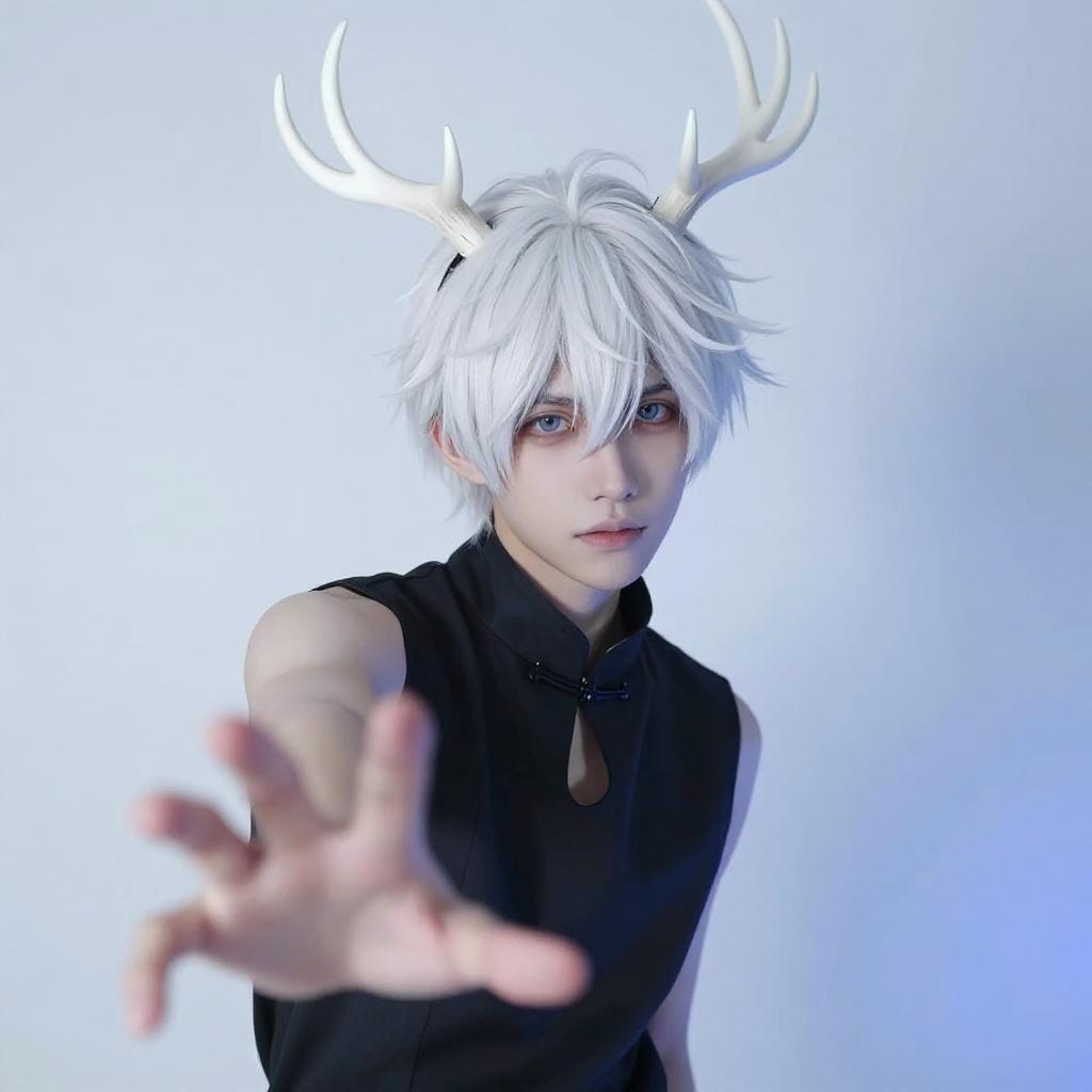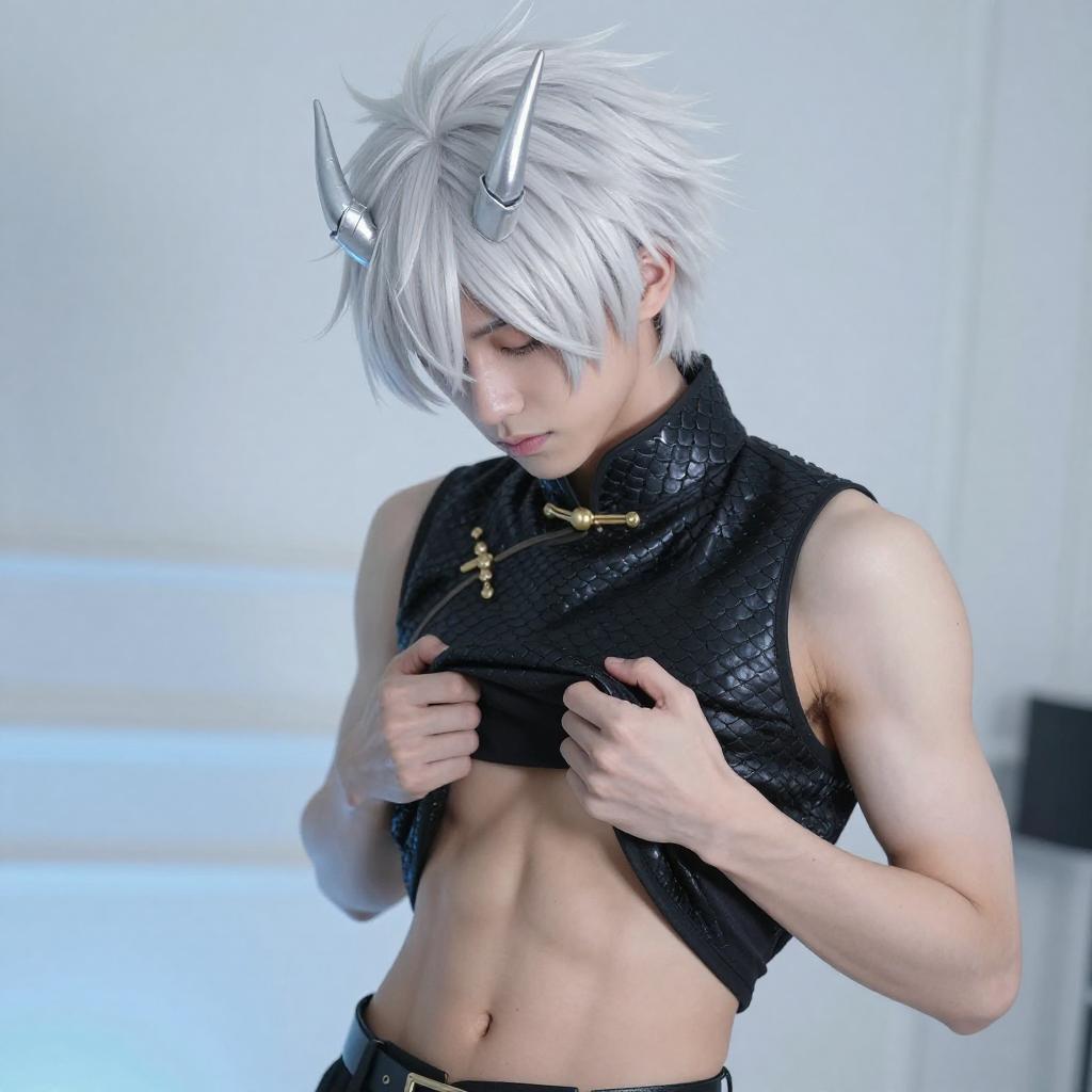 Photograph of a young person with pale skin, silver-white hair, and small white horn-like accessories, squatting with legs apart. They have green eyes, pink blush on cheeks, and their tongue slightly out. Wearing a black sleeveless top, they look directly at the camera with a playful expression. The background is a gradient of blue and white.