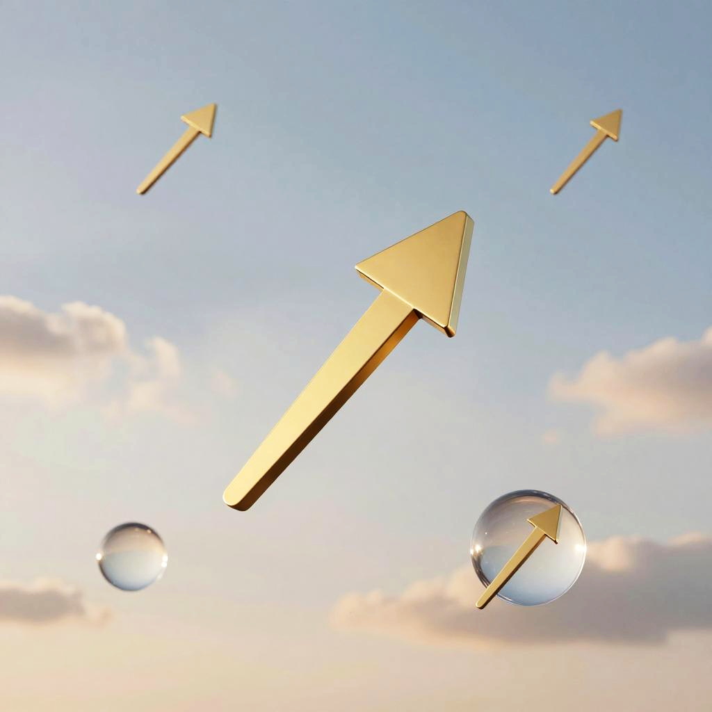Progress symbols made of gold and glass, floating in a serene sky with soft pastel clouds, elegant and minimalist style, high resolution, ambient lighting