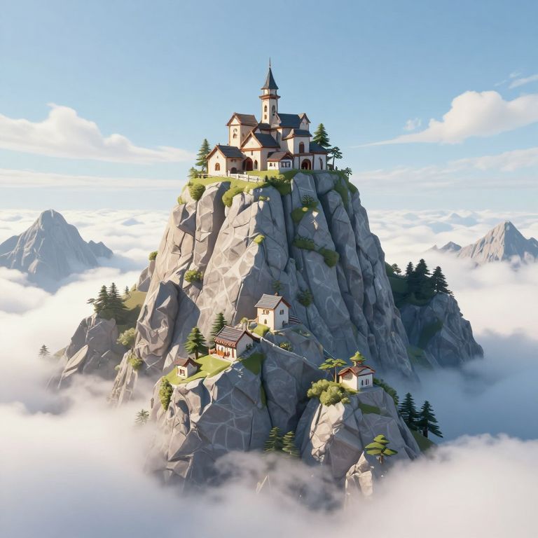 A majestic 3D-rendered mountain peak rises above a sea of clouds, crowned by a serene village with architectural details reminiscent of fantasy-inspired digital art, creating a timeless and ethereal landscape.
