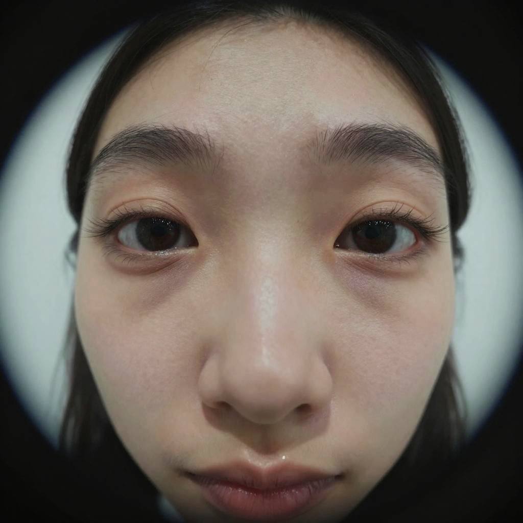 Close-up fisheye effect face, whimsical distortion, focus on nose and eyes, smooth gradient background, soft light reflections, digital surrealism