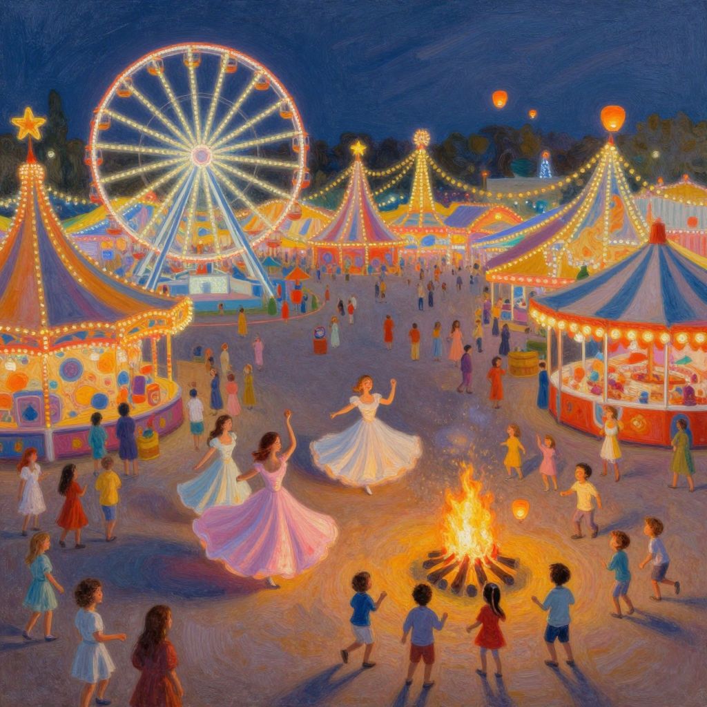 This vibrant, impressionist-style digital painting depicts a bustling evening market. The scene is filled with people of various ages, including children and adults, walking along a cobblestone street lined with vendor stalls. Stalls are adorned with colorful awnings and illuminated by warm, glowing lanterns. Vendors and customers are engaged in transactions, with some stalls displaying fresh produce and others offering goods like toys and clothing. The background features softly lit, pastel-colored buildings. The overall color palette includes warm yellows, blues, and pinks, creating a lively, inviting atmosphere. The painting's texture mimics the brushstrokes of traditional oil paintings, adding a sense of movement and depth.