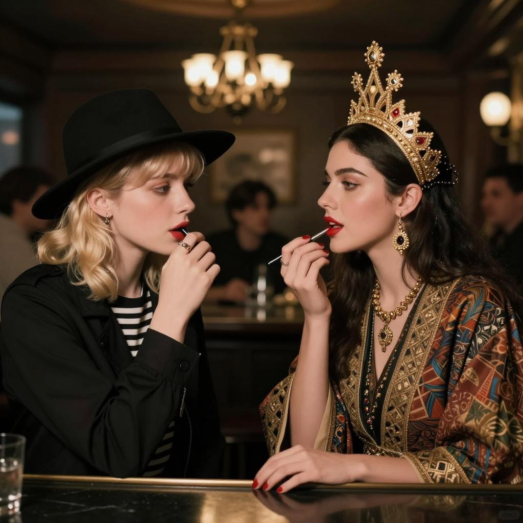 Photograph of three women in a dimly lit bar, seated at a table. Foreground woman with blonde curls, red dress, black headband, and pearl earrings, sips from a cigarette holder. Middle woman with brown hair, black dress, sips from a glass. Background woman with dark hair, black dress, smokes a cigarette. Table with glasses, red ribbon, and floral arrangement. Warm lighting.