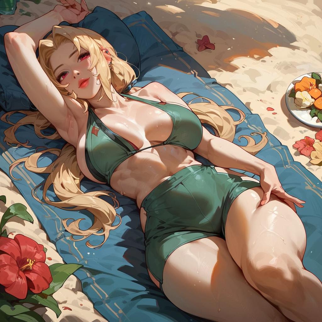 Digital artwork of a muscular man and a blonde woman sitting and embracing each other on a sunlit urban street. The woman wears a navy sports bra and black shorts, smiling seductively while holding the man tightly in a scissorhold. The man is shirtless with short dark hair and black shorts, sitting with his back to the viewer. Sweat glistens on their skin, adding a dynamic and intimate atmosphere to the scene. The background features ivy-covered walls and light-filled buildings.