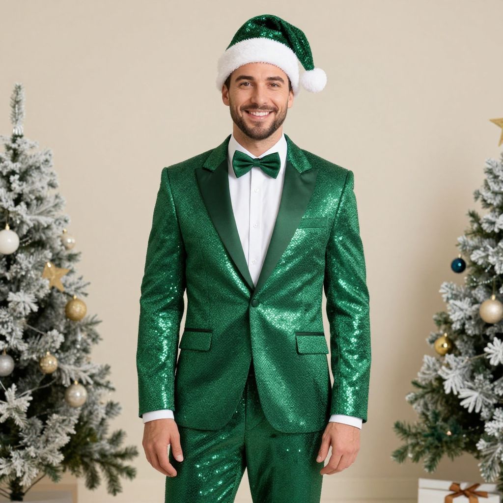 Photograph of a smiling man with light skin, dark hair, and a trimmed beard, wearing a glittery green tuxedo with a matching bow tie and green Santa hat with white trim. He stands in front of two decorated Christmas trees, each adorned with snow-like branches, gold and white ornaments, and small lights. The background is a plain, light-colored wall, emphasizing the festive attire and holiday decorations. The man's outfit and hat have a shiny, festive texture, and he exudes a cheerful, celebratory vibe.