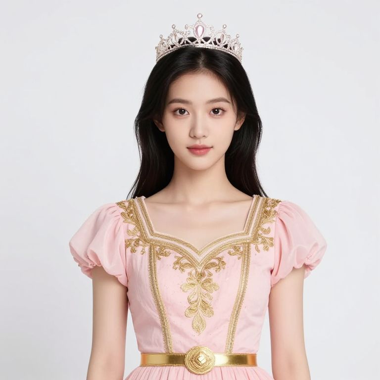 Asian girl with black hair and a crown on her head. She is wearing a pink dress with gold embroidery and a gold belt.
