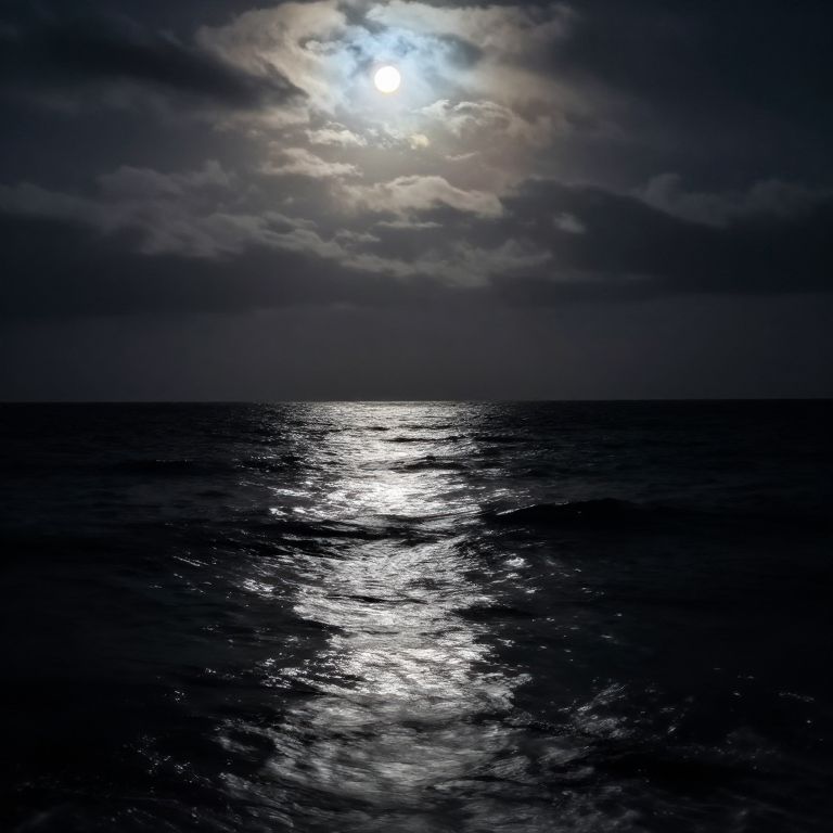 Moon reflection on ocean under cloudy night sky, silvery light fragmented across restless waves, dramatic contrast between dark clouds and glowing water, moody and atmospheric seascape
