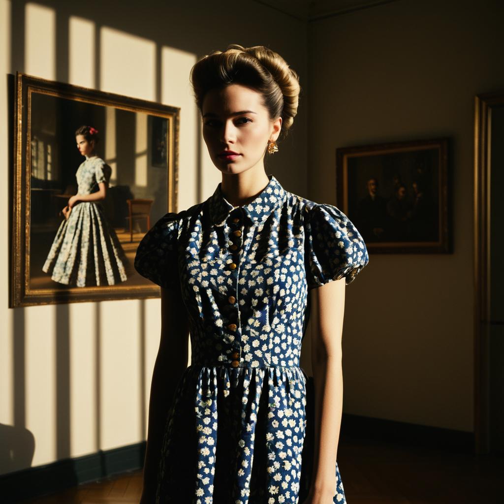 Portrait of a young woman with a shadow fade hairstyle, wearing a blue vintage dress with a white floral pattern and wooden buttons, standing in an art gallery interior. The warm spotlight casts dramatic shadows, enhancing the fashion editorial style. The woman has light skin and elegant styling, including gold earrings, and her hair is styled in an intricate updo.