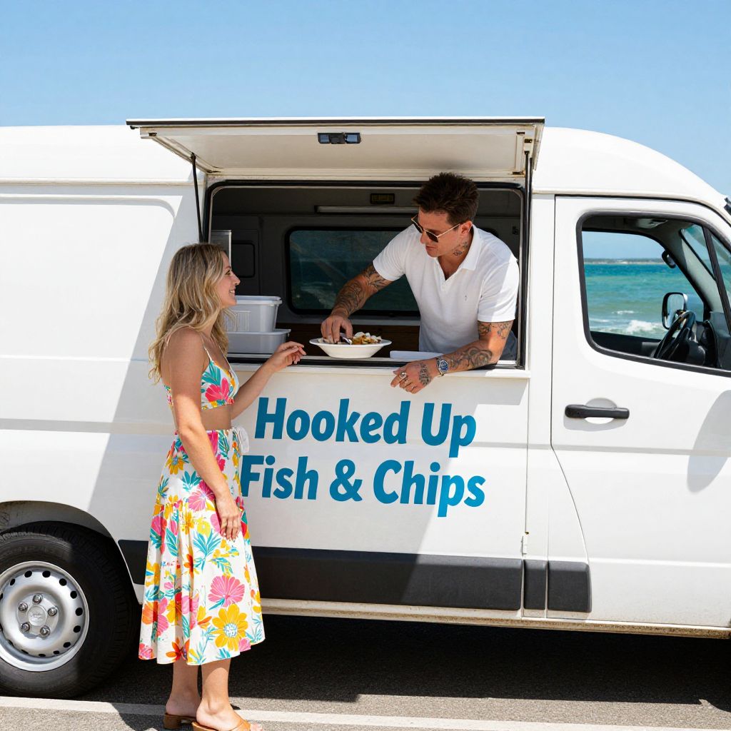 Vibrant summer vibes unfold as the \"Hooked Up Fish & Chips\" van, painted in crisp white with bold lettering, parks gracefully at Surfers Point in Margaret River, where a smiling woman in a floral skirt stands beside it while a man with tattoos leans out the open window, ready to serve fresh seafood delights against the backdrop of turquoise waters and clear skies. #travelwardrobesummer