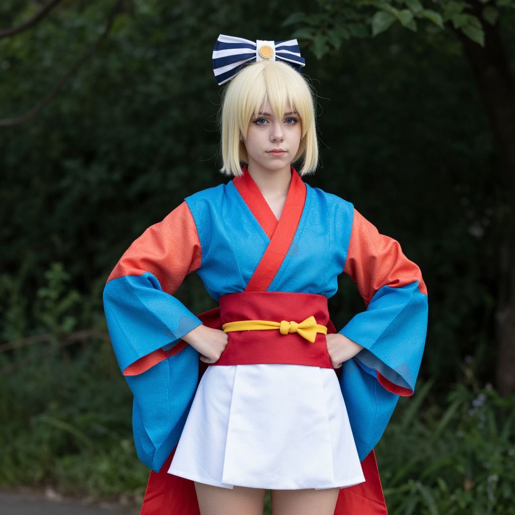 Photograph of a blonde woman in an anime-style blue and red kimono with white skirt, black and white hair bow, standing confidently in a forest