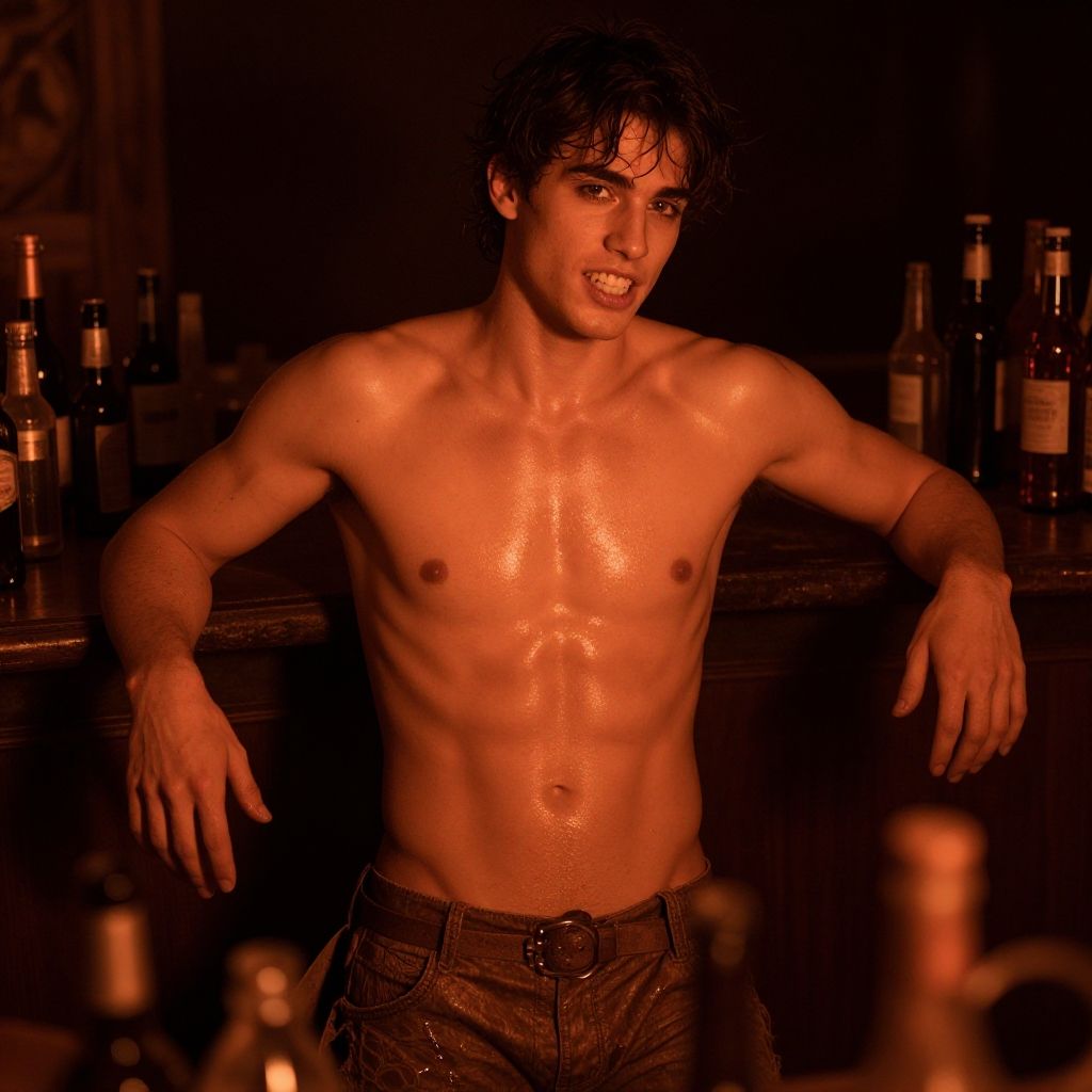 (Artistic, Beautiful/Handsome Roman, Detailed Eyes, Detailed Mouth/Teeth, Full Body, Perfect features, Full Body:1.2), Friarmoody lighting, Neon Accents, soft cinematic light, soothing tones, Soft Image, Dusk Particles, drunk, Process Art 21yo, Sexy/Handsome Victorian Style, muddy, crowded bottles bar, intricate details, hdr, hyperdetailed, cinematic, dark shot, Monochromatic deep orange filter colors, film grainy, muted colors, Kinemacolor, Skin Shine, Shiny Skin, Luscious skin, Flawless Skin, Vicious Mode, Unique Lighting, Deep Contrast, Action Pose