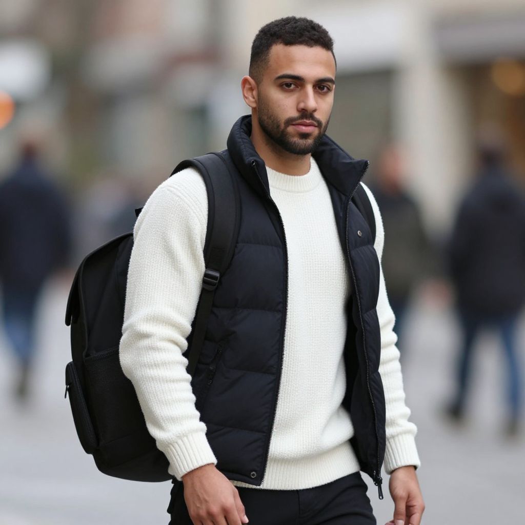 Fleece sweater costume, 1boy, male focus, solo, jacket, blurry background, outdoors, blurry, looking at viewer, white sweater, facial hair, sweater, bag, black jacket, short hair, realistic, backpack, open jacket, pants