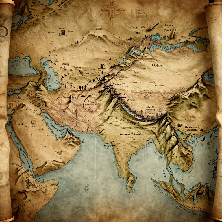 Ancient style Alexander the Great conquest map, featuring mountain ranges, rivers, old cities, and troop movements, hand-drawn calligraphy labels, rich earthy tones, textured background resembling scrolls, atmospheric lighting blending history and art