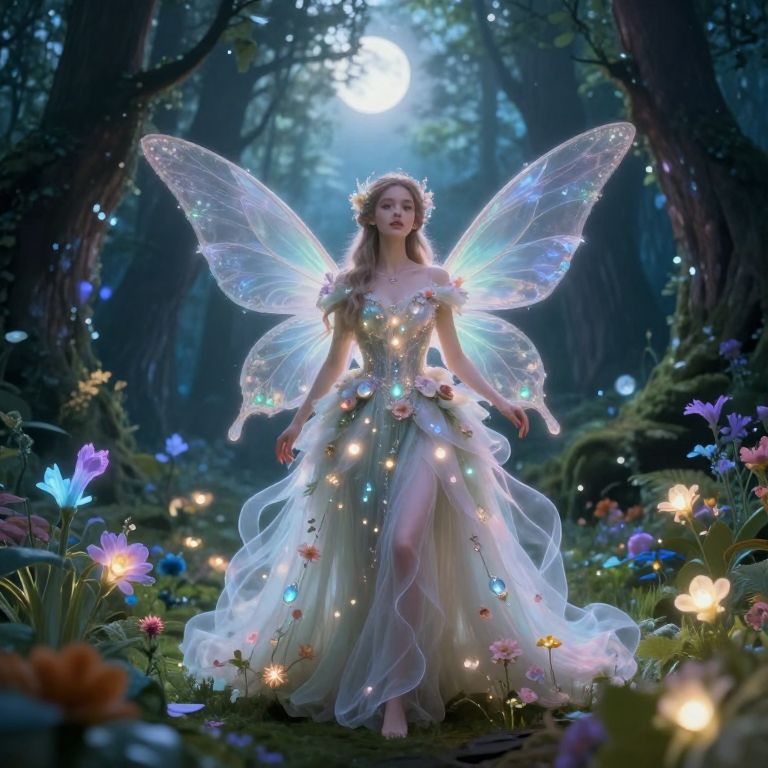A digital fantasy illustration depicts a young girl with long, wavy red hair and a floral crown, wearing a white, frilled dress, kneeling in a moonlit forest. She holds a glowing teacup, sparkling with magical light, while a small, fluffy fox sits at her feet. Surrounding her are glowing fireflies, colorful flowers, and a rabbit in the background. The night sky and full moon illuminate the scene, creating a whimsical, enchanting atmosphere. The girl's delicate features and soft, dreamy expression enhance the magical, fairy-tale-like quality of the image.