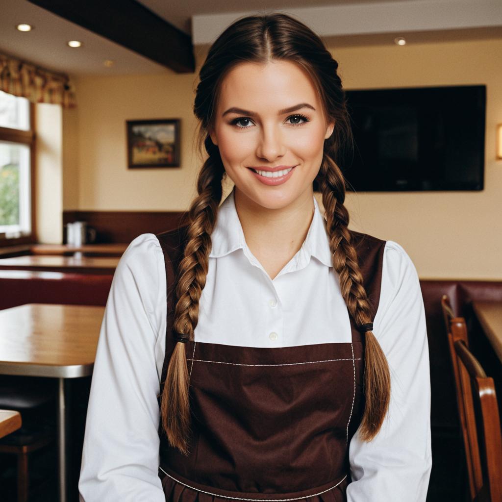 Portrait of a young woman with long brown hair styled in braids, wearing a traditional German waitress costume consisting of a white long-sleeve shirt and a brown apron. She is smiling and looking directly at the camera, standing indoors in a restaurant setting with wooden tables and chairs in the background.