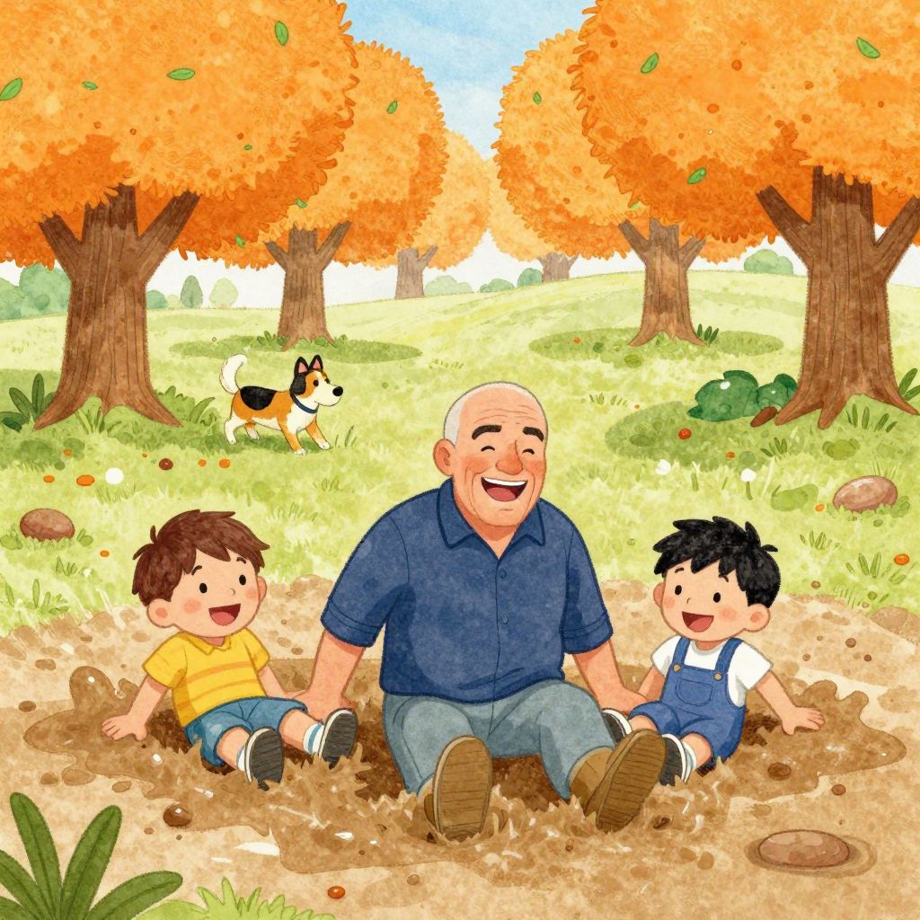 Tony Soprano Two laughing teenagers rolling in the mud in an orange grove, dog in the background, watercolors, clipart, childrens book illustration, pastels,