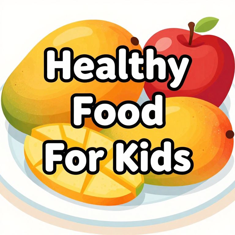 A vibrant cartoon-style illustration featuring a plate of colorful fruits, including mangoes and apples, with bold text overlay reading \"Healthy Food For Kids,\" rendered in a clean, digital art medium with bright, saturated colors and simple, rounded shapes.