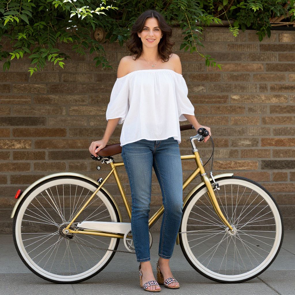 Smiling woman stands confidently beside a sleek gold bicycle, showcasing her stylish ensemble of a loose white smock top and fitted blue jeans, complemented by patterned sandals, all set against a backdrop of a textured brick wall and lush green foliage.