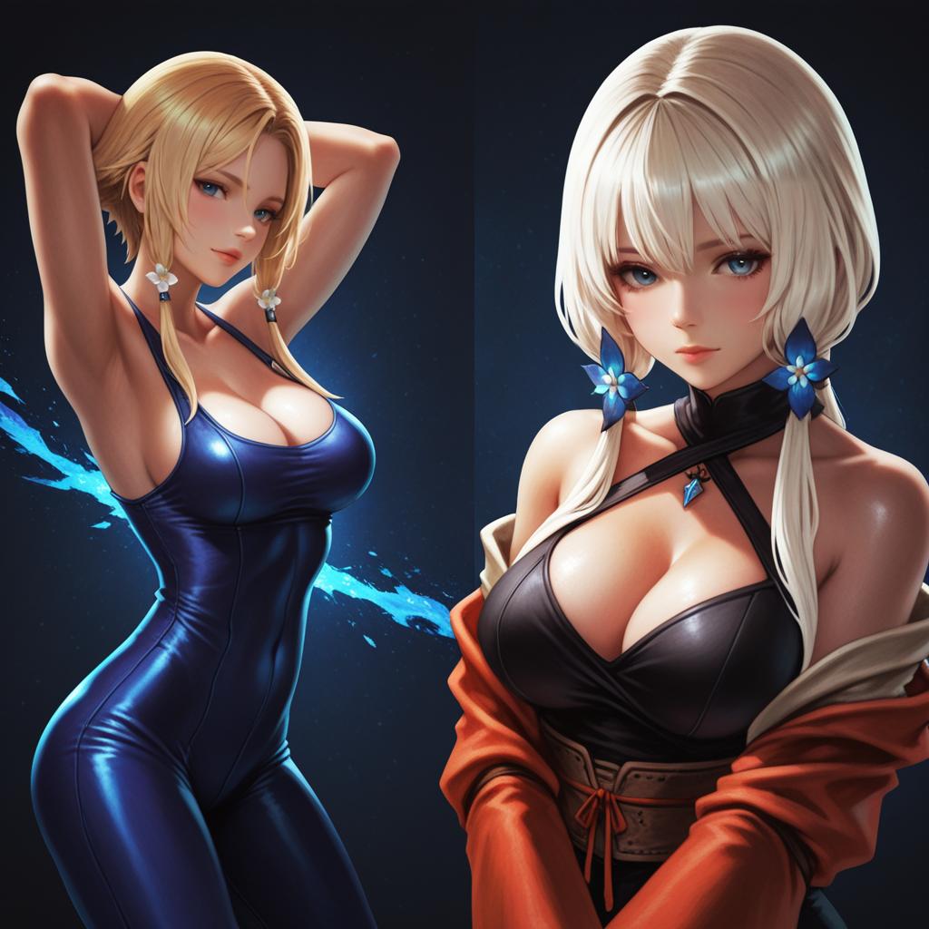 Monk (fft), final fantasy, 1girl, blue eyes, short hair, blonde hair, large breasts, cleavage, bare shoulders, unitard, unitard, by artist monori rogue, dark_illustrious
