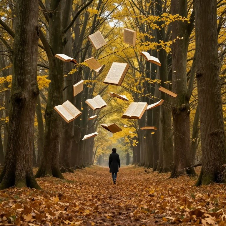 Books float gracefully through a mystical forest, their pages whispering forgotten tales as a solitary figure walks beneath them, surrounded by towering trees and a carpet of golden leaves.