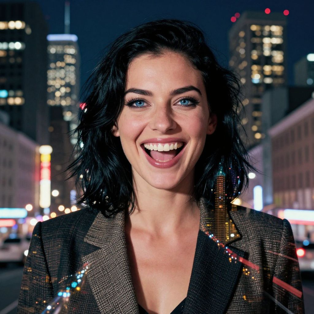 Photograph of a smiling woman with fair skin, blue eyes, and shoulder-length black hair, wearing a brown, textured blazer with colorful, reflective sequins. She has a bright, open-mouthed smile revealing white teeth. The background features a nighttime cityscape with blurred, brightly lit skyscrapers and neon signs, creating a vibrant, urban atmosphere. Her expression and the city lights suggest excitement or joy. The image has a high-contrast, pop-art style, emphasizing her facial features and outfit against the colorful, busy city backdrop.