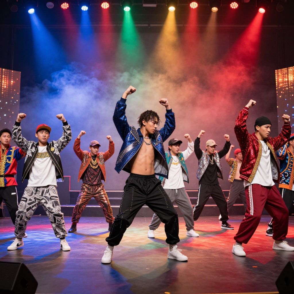Surprise dance outfits showcased on vibrant stage, glowing under colorful spotlights, dancers in dynamic poses wearing sparkling, eclectic costumes blending modern streetwear and traditional dance attire, energetic atmosphere with smoke and confetti effects, high detail.