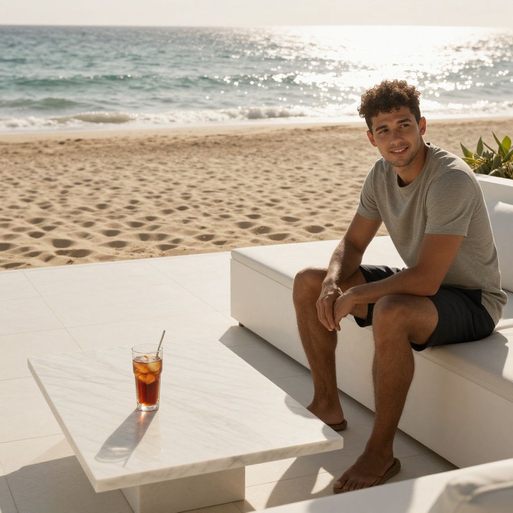 A modern seaside patio overlooking the shoreline, with clean white tiles, a marble coffee table, and a glass of iced tea on a side table, a young man with short curly hair and a warm, thoughtful expression sitting on a low bench, and the ocean shimmering under warm afternoon sunlight with soft shadows playing across the sand.