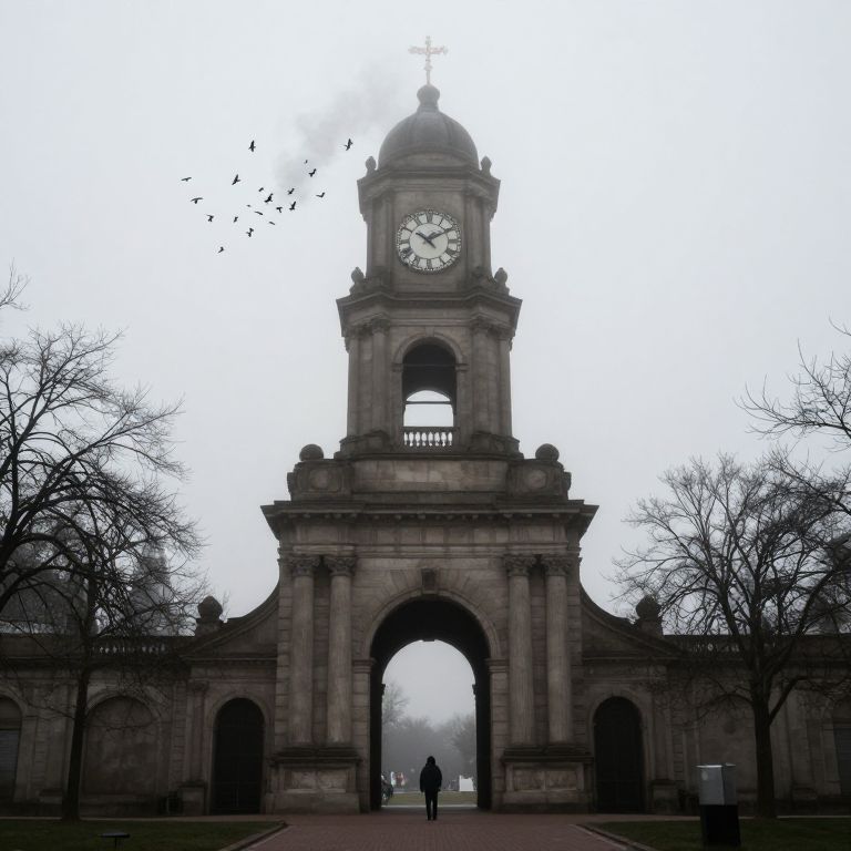 Photograph of a grand, gray stone clock tower with a large central archway, standing prominently against a cloudy, overcast sky. The clock face is white with black numerals, and a small flock of birds is flying near the top. Bare trees frame the tower on both sides, their branches creating a stark, skeletal silhouette. A single, small figure stands in the archway, silhouetted against the misty background. The path leading to the arch is red brick, and a trash bin is visible on the right. The overall mood is somber and slightly eerie.