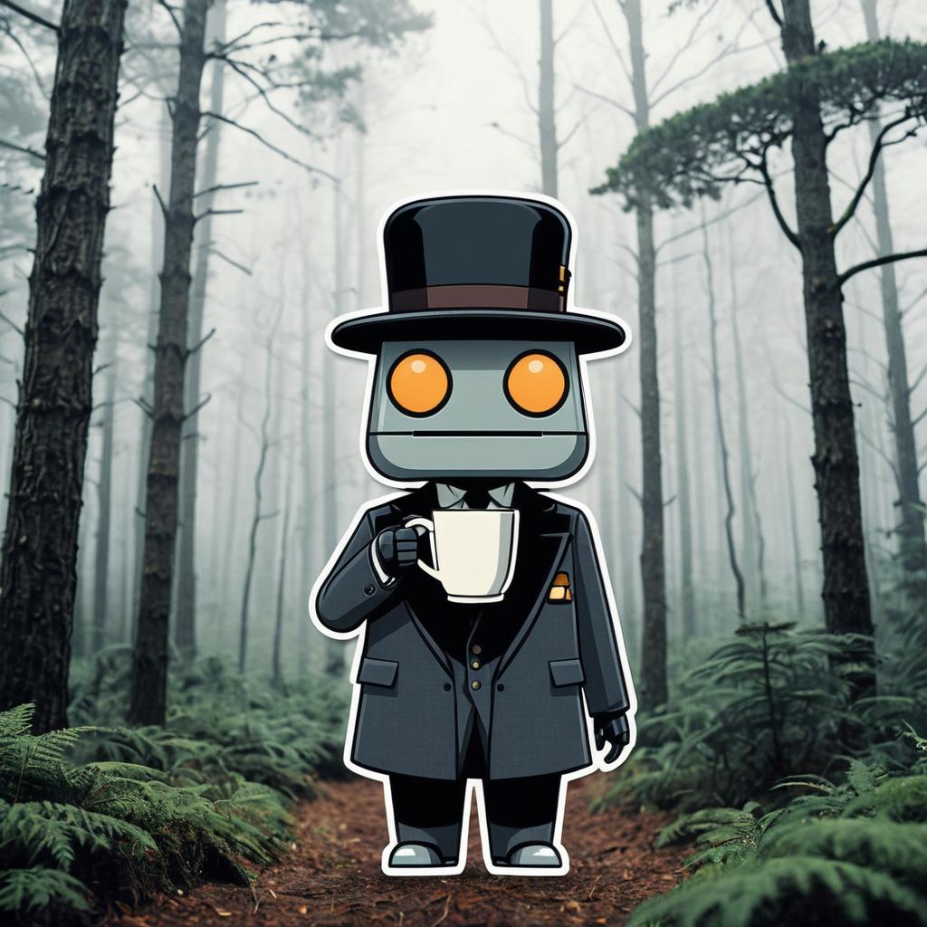 Gentle giant robot in a bowler hat holding a steaming cup of tea, Kawaii Style, die cut sticker, no text, 2d art style sticker, vector style, clean lines on a misty forest background only, misty forest background