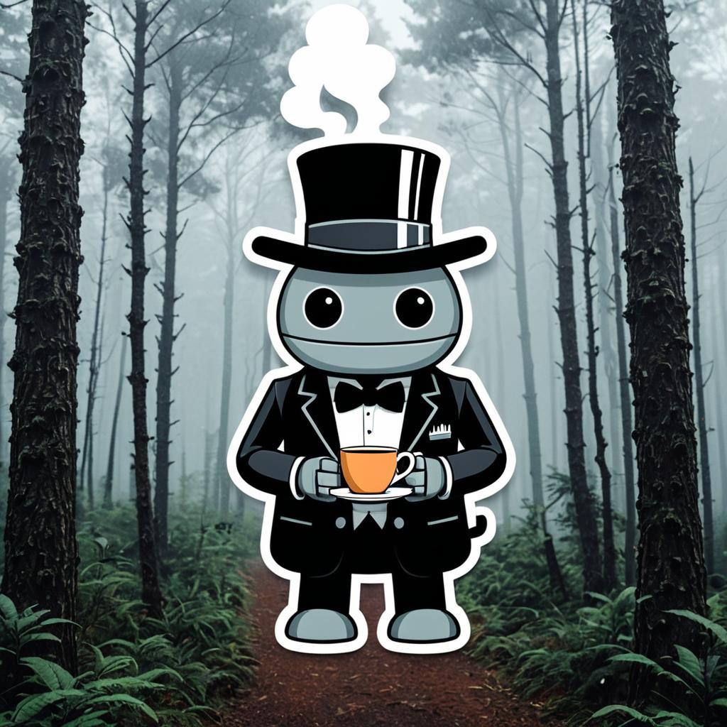 Illustration of a gentle giant robot in a bowler hat and formal suit holding a steaming cup of tea. The image is created in a kawaii vector art style with clean lines, presented as a die cut sticker. The robot stands on a misty forest path surrounded by tall trees and ferns, emphasizing a serene and whimsical atmosphere.