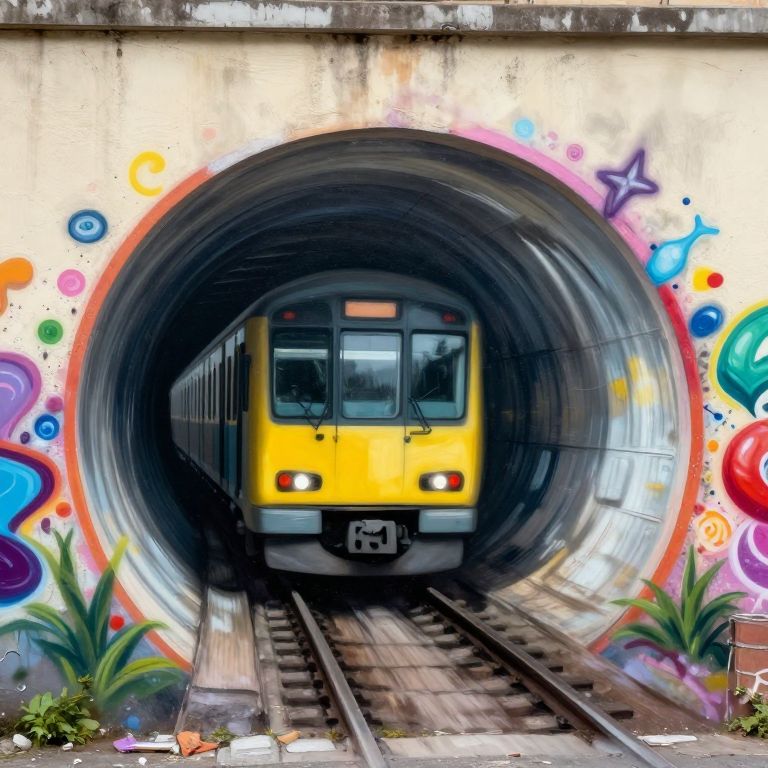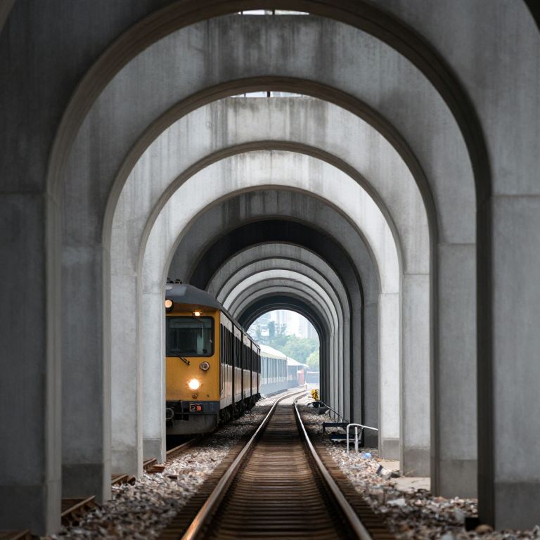 A train emerges from an endless cascade of nested archways, defying spatial logic as it loops infinitely into the horizon, creating a mesmerizing illusion of infinite recursion.