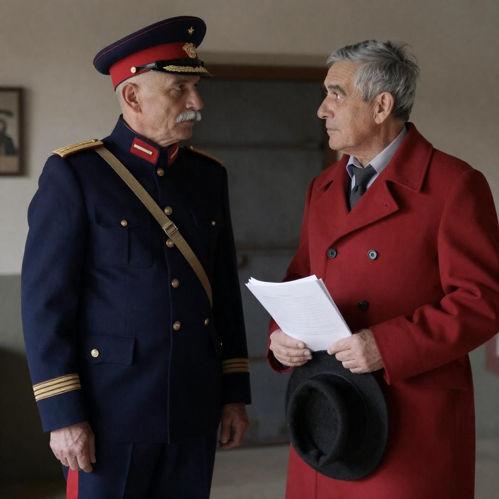 Two older men with gray hair and mustaches stand next to a red and green piece of machinery. The man on the left wears a brown hat, blue shirt, and brown vest, pointing at the machinery. The man on the right wears a brown coat and striped shirt, looking up at the man on the left. Green trees in the background.