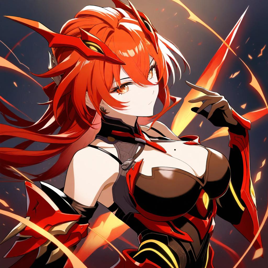 Digital anime-style artwork of Murata Himeko from the Honkai series, depicted as the Vermillion Knight. The character has long red hair adorned with a red dragon-like hair ornament, yellow eyes, and a mole on her chest. She is wearing a detailed armored leotard with black gloves, a stylized red and black china dress design, and is posed with fiery energy effects in the background.