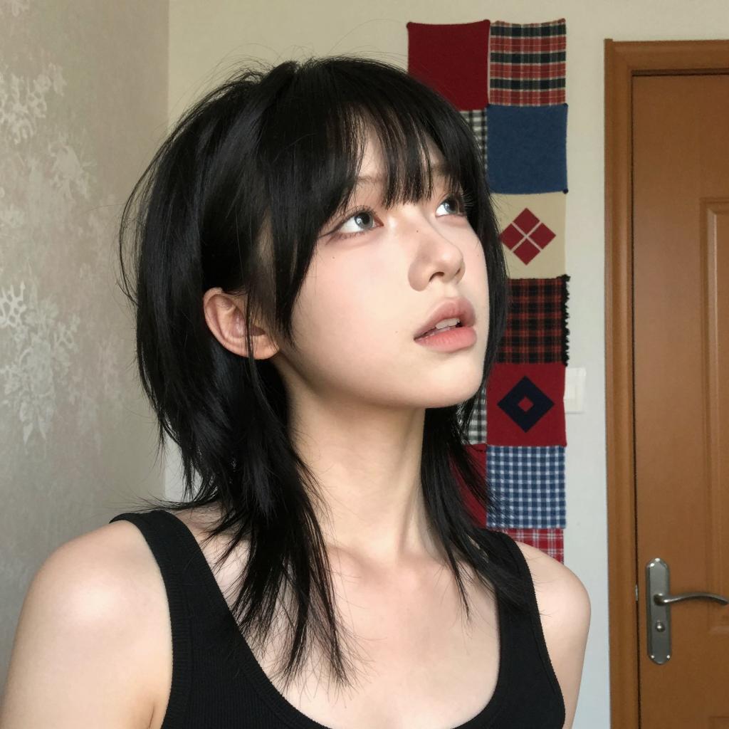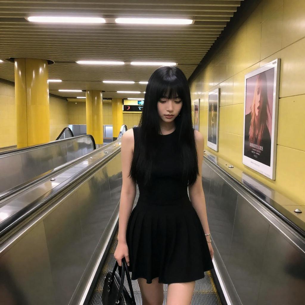 Young woman with long black hair, bangs, wearing a sleeveless black dress, standing on escalator in yellow-lit underground station. She holds a black bag in her right hand, looking slightly downward. Yellow cylindrical pillars and posters on walls in background. Bright fluorescent lights on ceiling. Reflections on escalator railings. Station has a curved design.