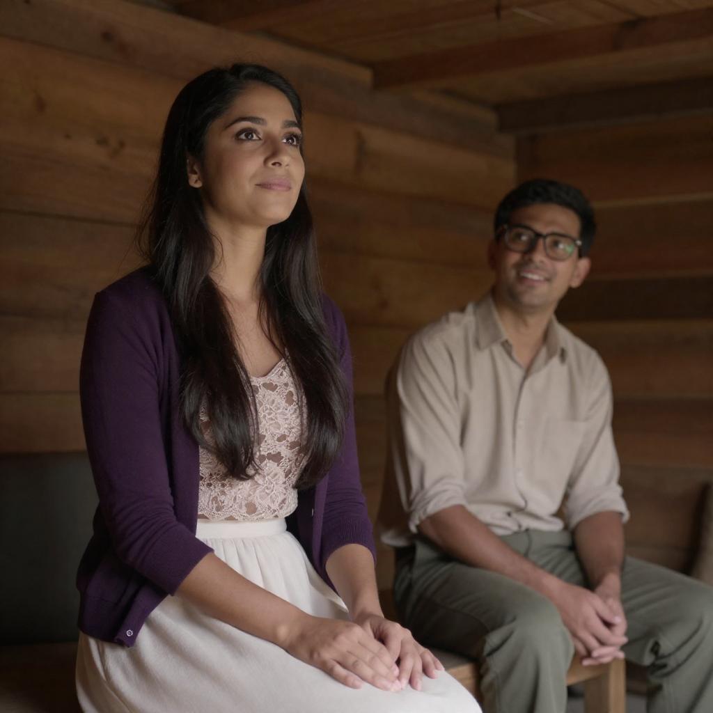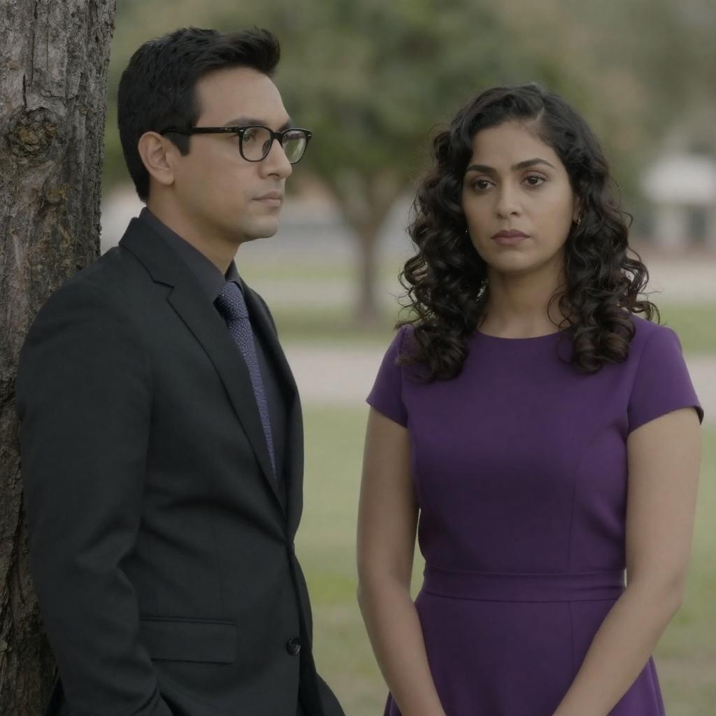 Photograph of two people standing outdoors. A man with dark hair, glasses, and a black suit looks intently at a woman. The woman has dark, curly hair and wears a purple dress, looking away. Tree trunk in the foreground. Both serious expressions.