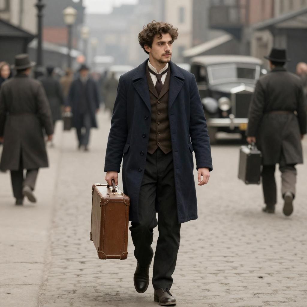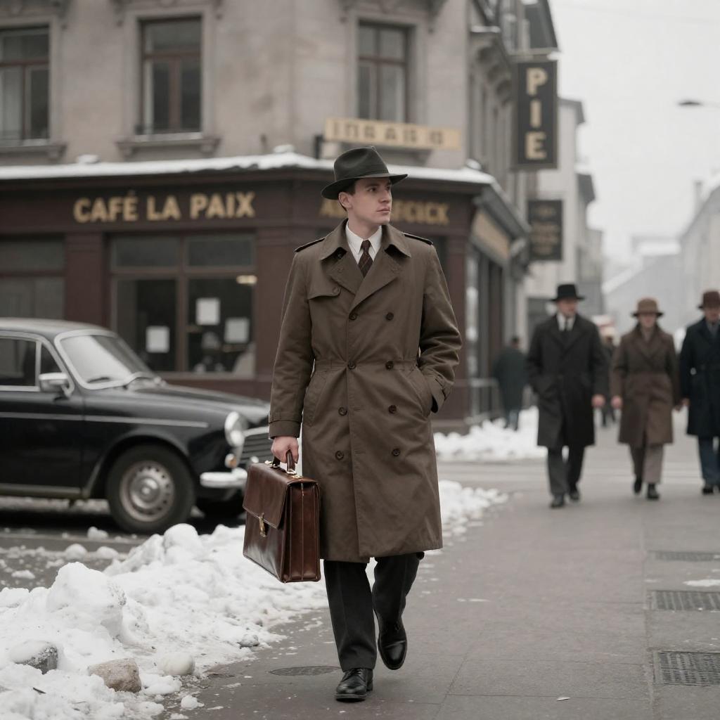 Photograph of a vintage street scene. A man in a brown trench coat and fedora walks center, carrying a brown leather briefcase. He stands in front of a multi-story building with "Café de la Paix" signs. Snow piles line the sidewalk, and a black car is parked to the left. Other pedestrians are in the background.